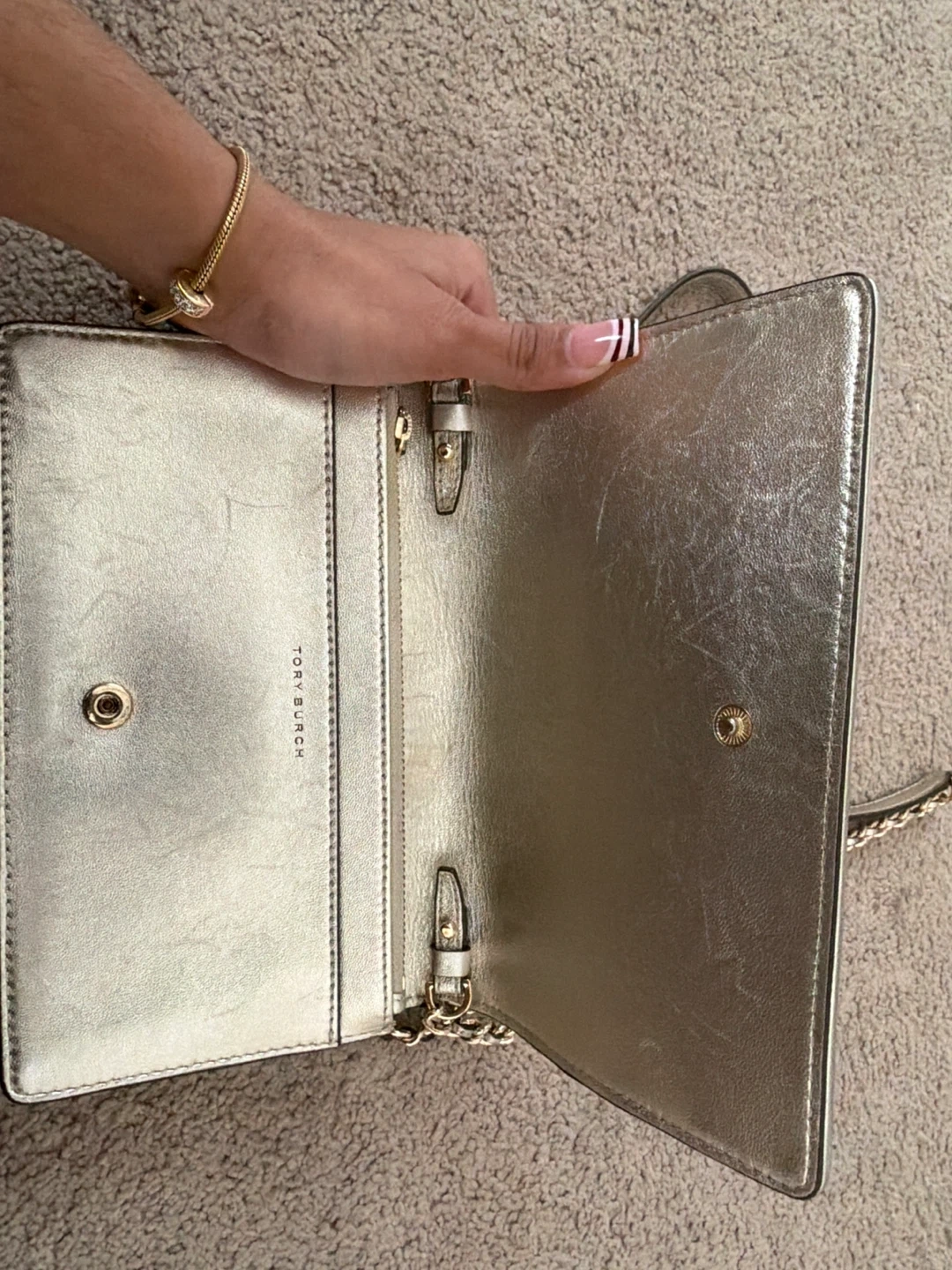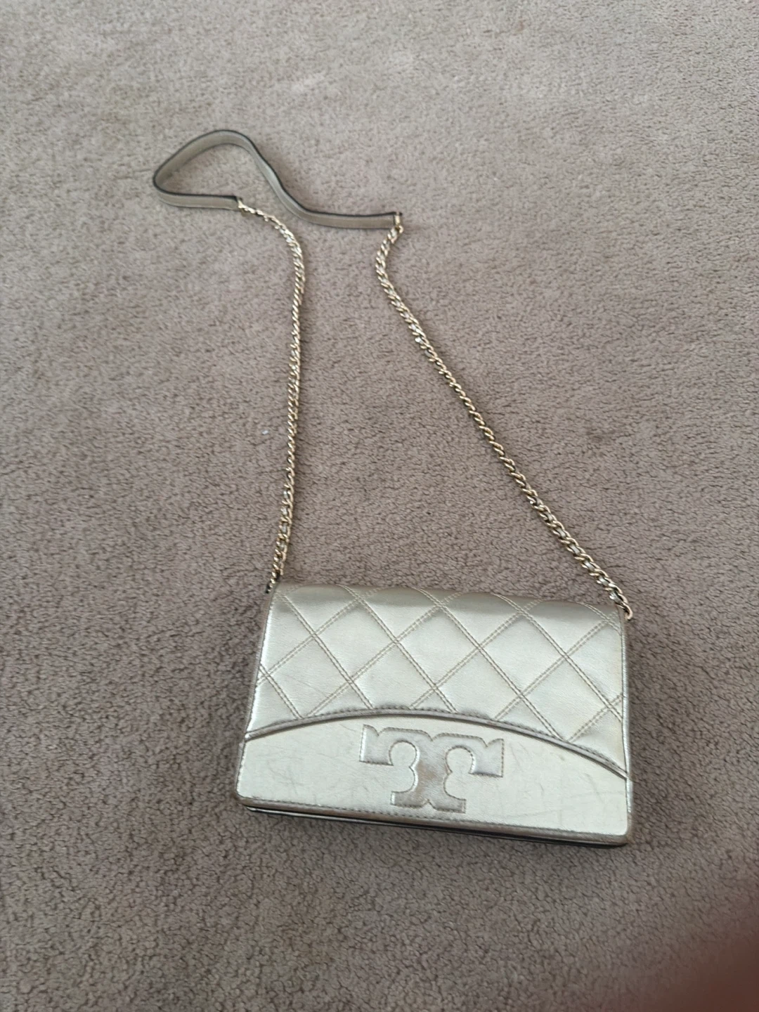 This Tory Burch wallet bag is a metallic gold colour. It features multiple card slots and a zippered coin pocket inside. It also has a detachable chain strap for crossbody wear.