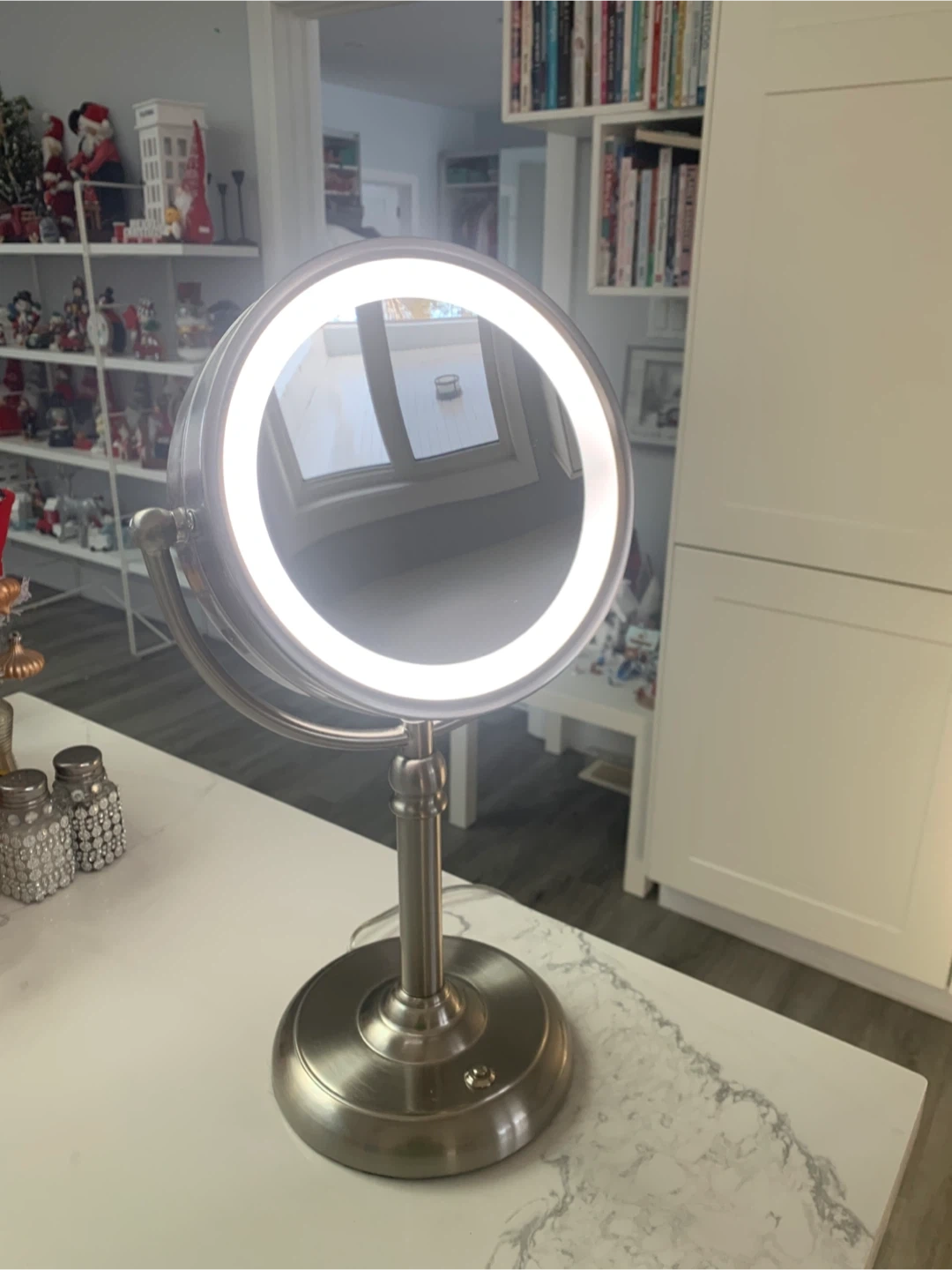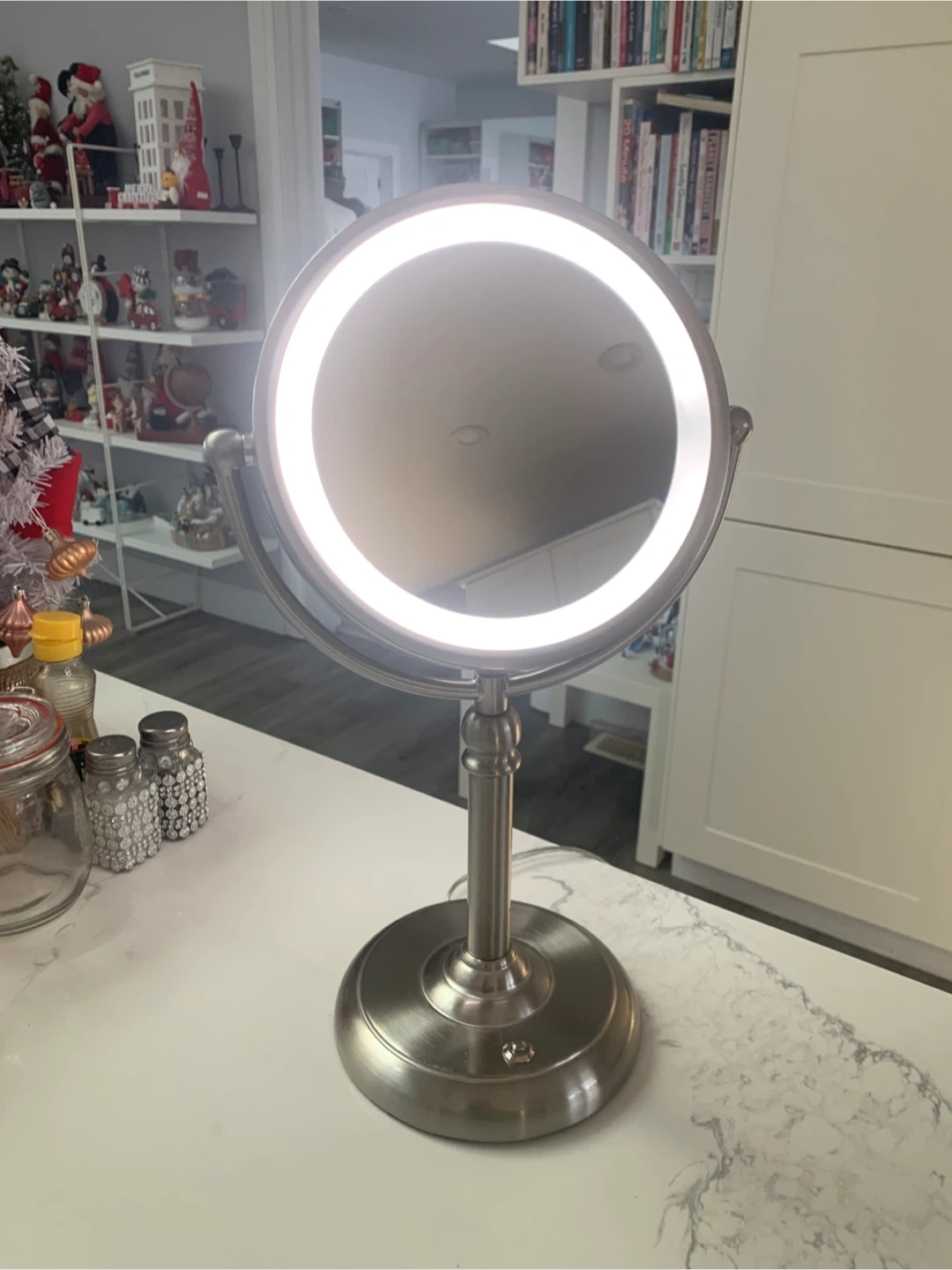 This is a tabletop makeup mirror with an LED light ring. It has a brushed silver finish and a dual-sided magnifying feature. The base is weighted for stability.