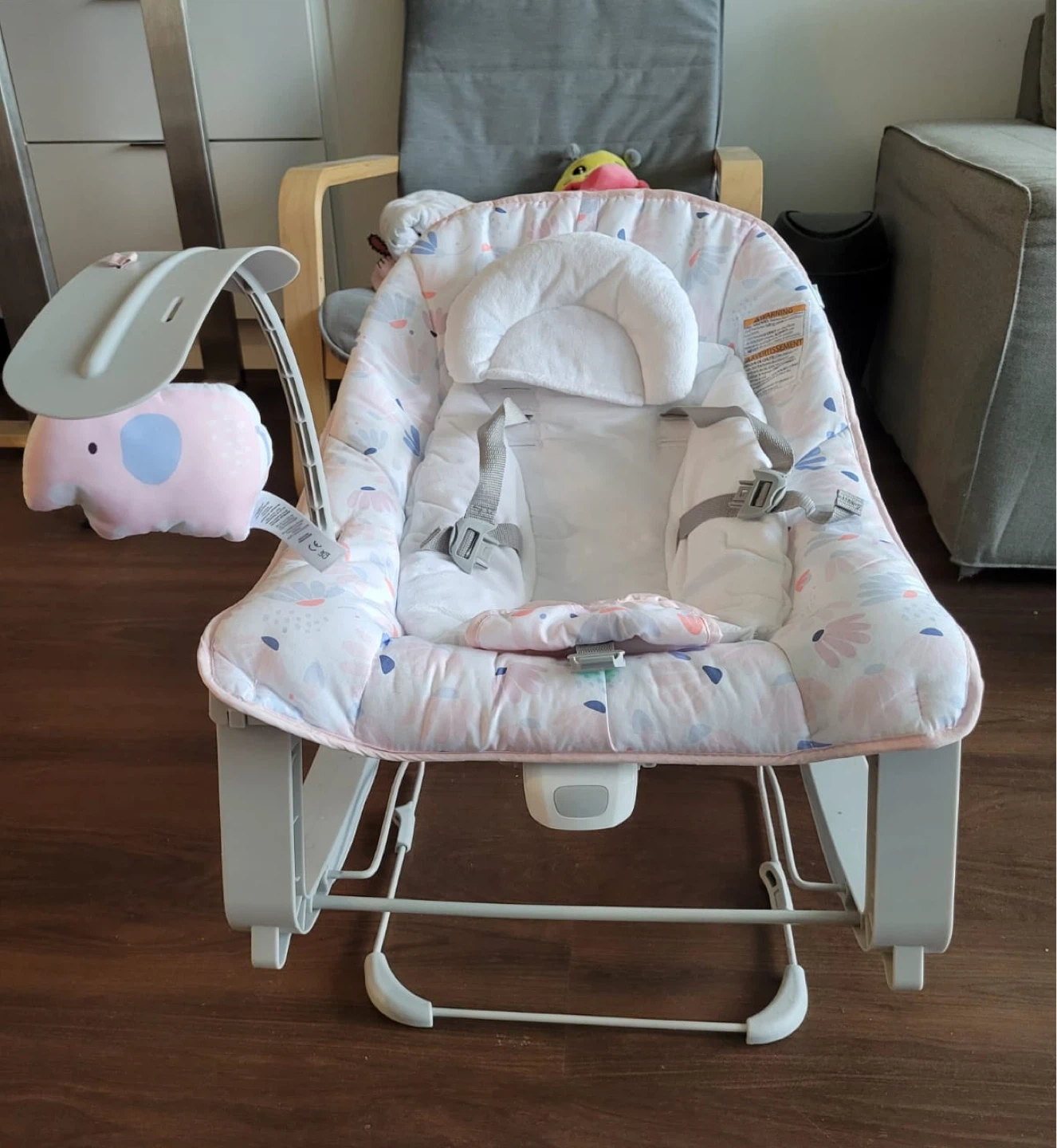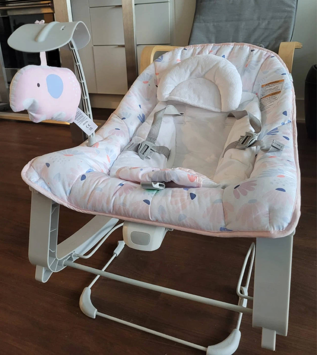This infant rocker seat features a gentle rocking motion and a removable toy bar. It has a soft, padded seat and adjustable safety straps for your baby's comfort and security. It's great for soothing and entertaining your little one.