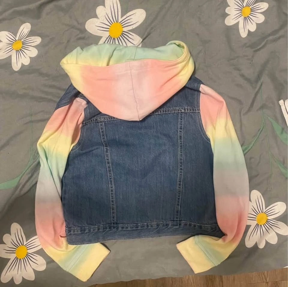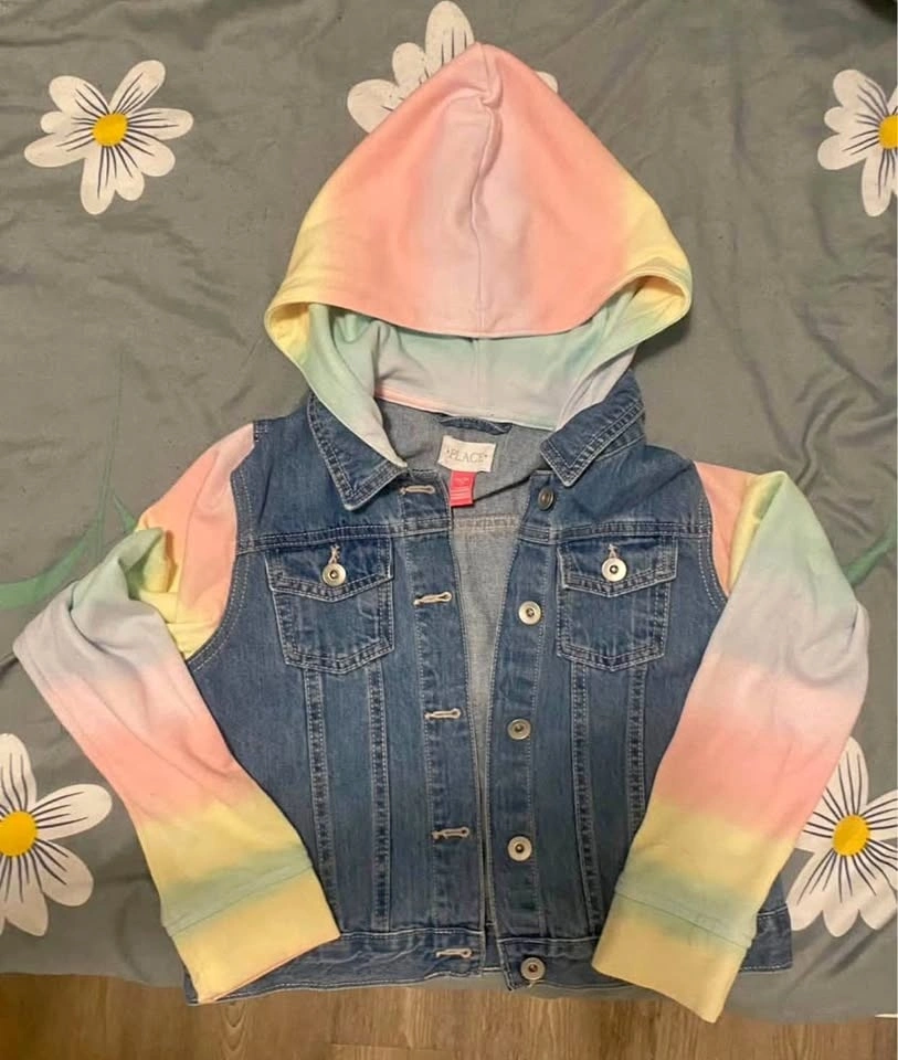 Colorful Children's Place jacket. Has denim body with soft rainbow tie-dye sleeves and matching hood. Size is L (10-12). Buttons up front and has chest pockets. Great for layering. New; never worn.