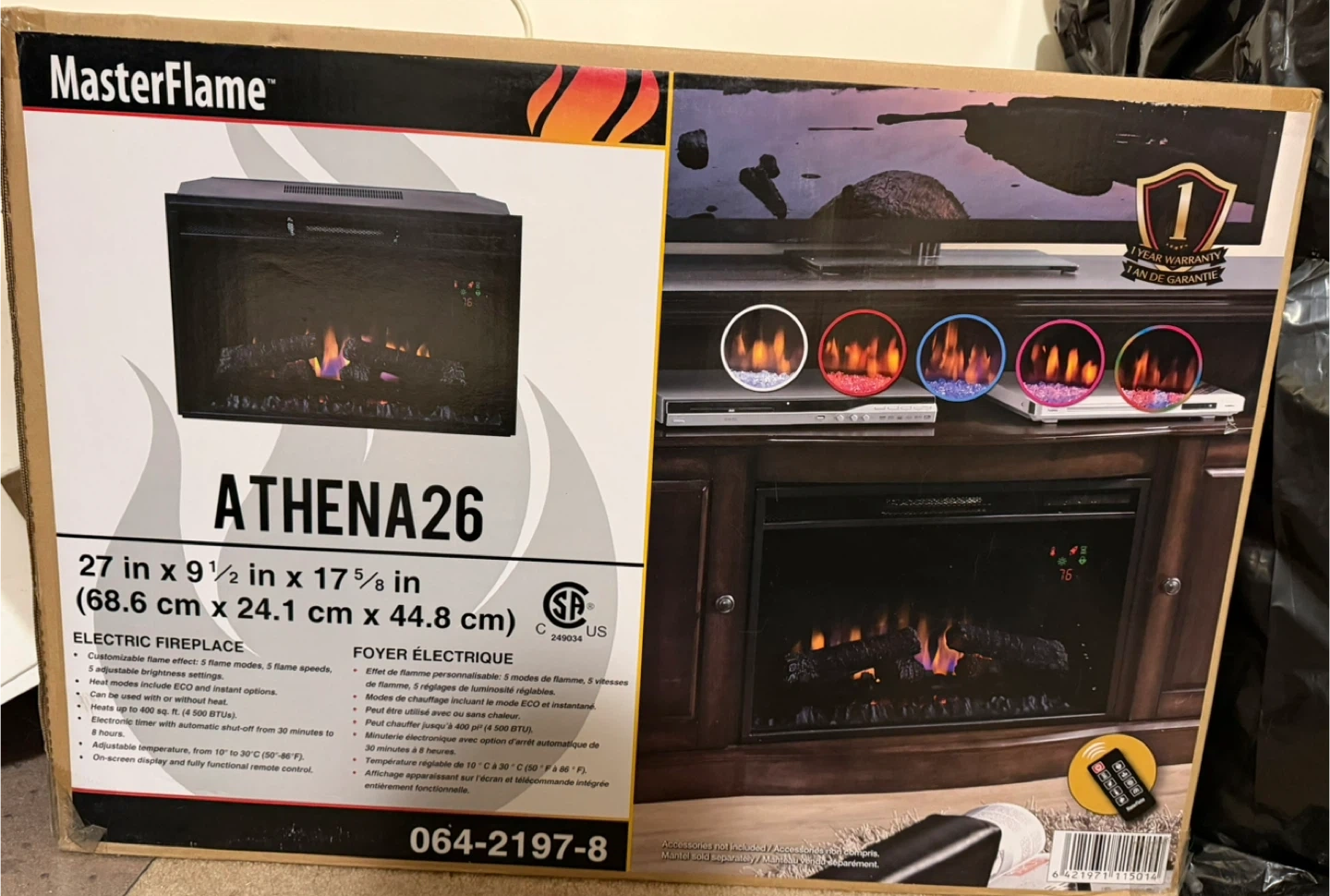 Selling a brand new MasterFlame Athena26 electric fireplace, still in its original packaging! It's 27 inches wide, 9 1/2 inches deep, and 17 5/8 inches high (68.6 cm x 24.1 cm x 44.8 cm). This electric fireplace has a customizable flame effect with 5 flame modes and 5 flame speeds. It can be used with or without heat and heats up to 400 sq ft (4 000 BTUs). It also has an electronic timer with automatic shut-off from 30 minutes to 8 hours, and an adjustable temperature from 10° to 30°C (50° to 86°F). It comes with a fully functional remote control