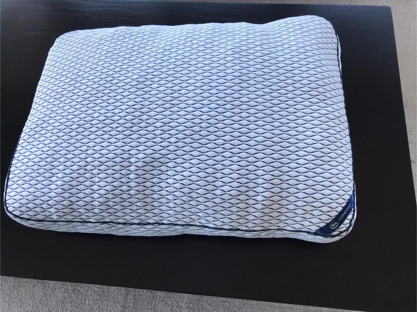 This Serta Comfort pillow has an outer cover made of 84% polyester and 16% polyethylene. It's filled with 100% shredded polyurethane foam for support. The inner cover is also 100% polyester. $75 Pair or $45 each
