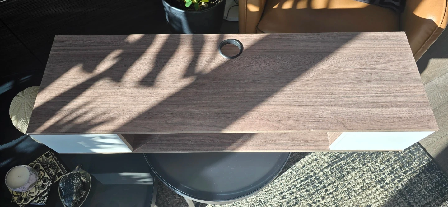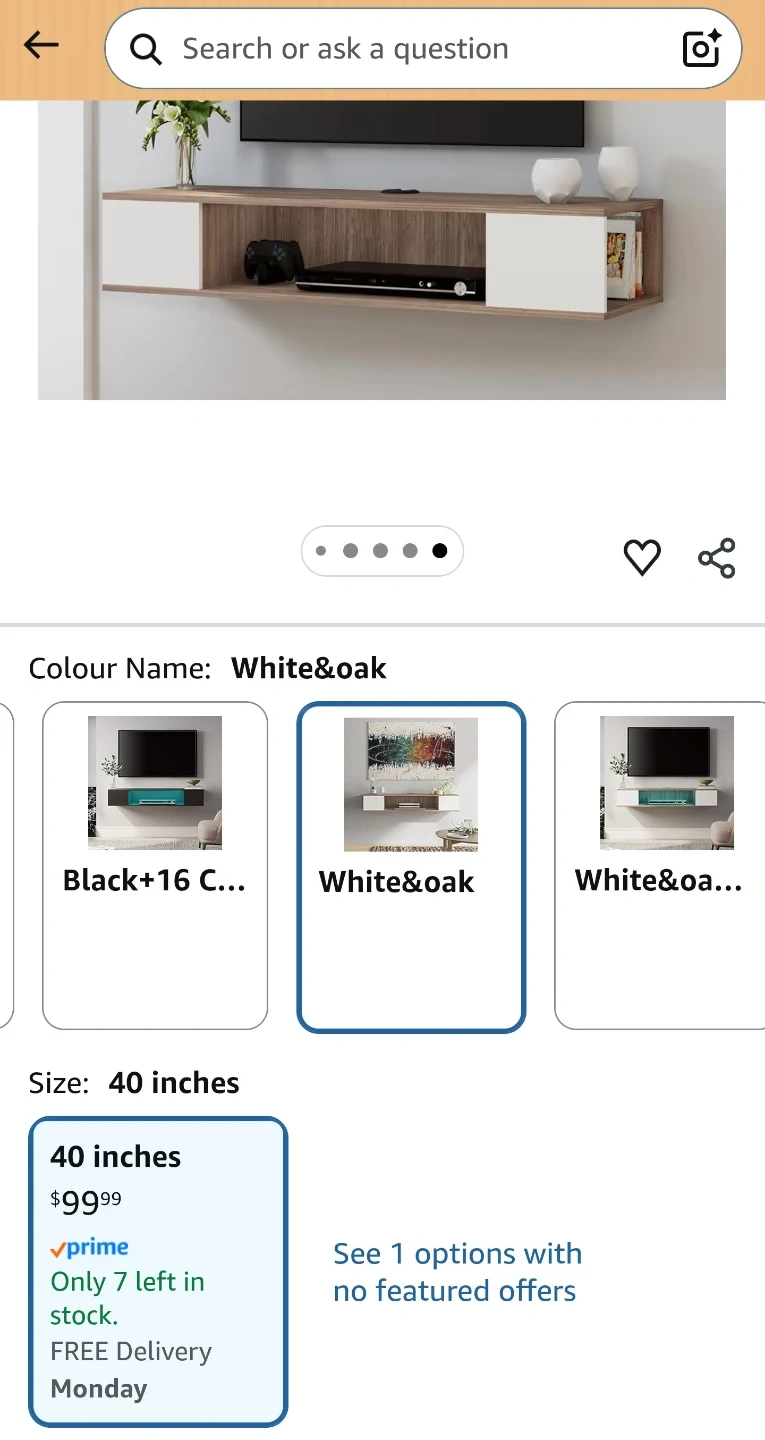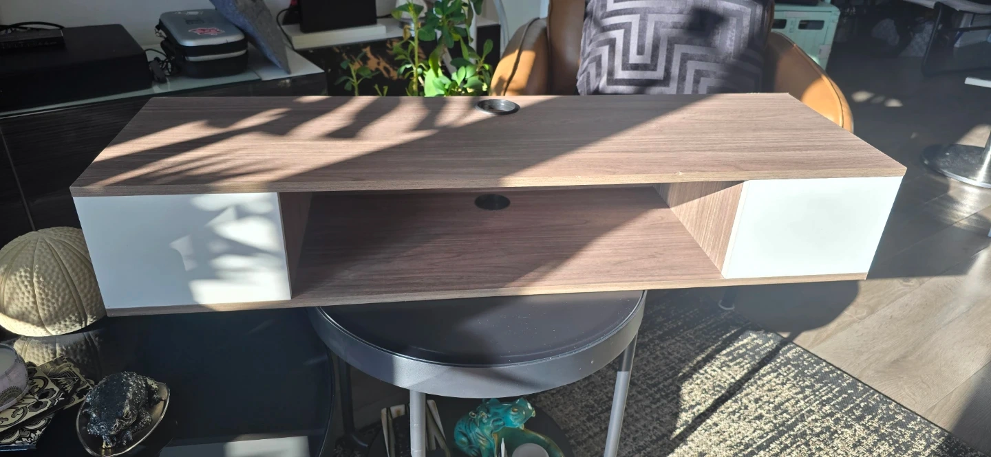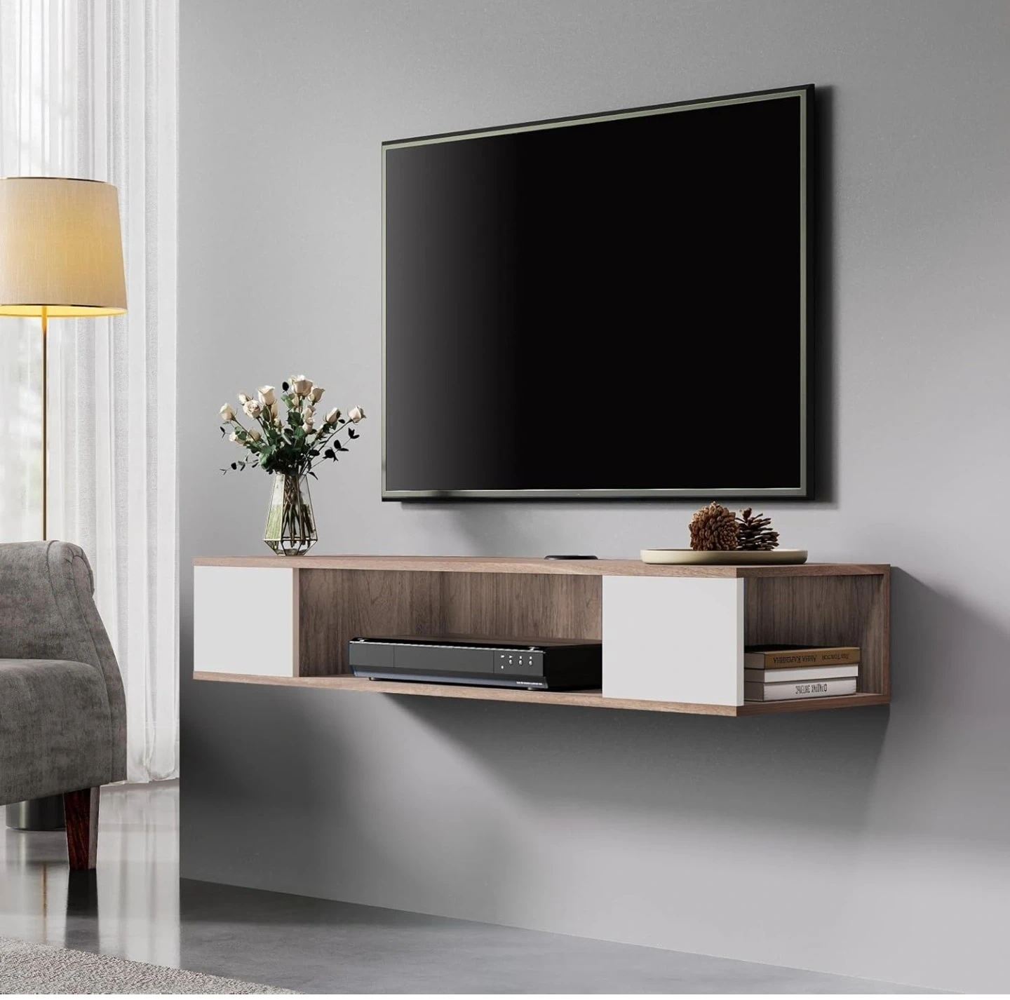 This is a stylish wall mount floating media console shelf with a wood grain finish and white accents. It offers two open compartments and two closed storage areas. Perfect for organizing your entertainment devices and accessories.