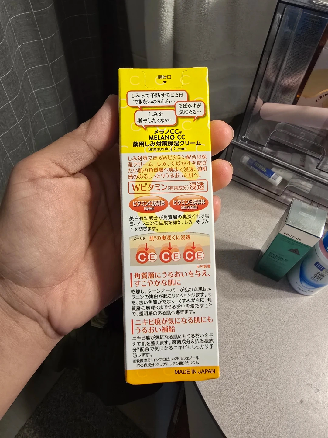 This is the Melano CC Brightening Cream, featuring W vitamin penetration. It's formulated to address dark spots and provide moisture. The cream contains active ingredients like Vitamin C derivative and Vitamin E derivative.