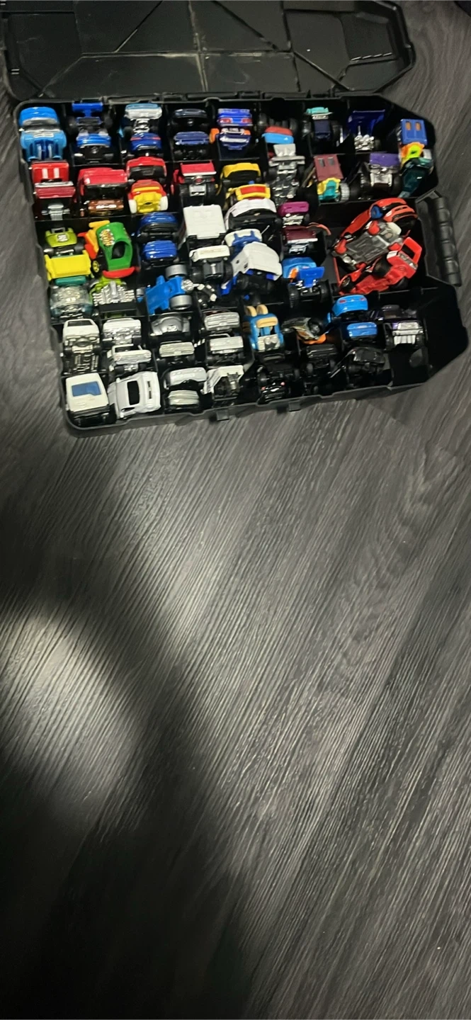 A collection of assorted die-cast toy cars stored in a black carrying case. Includes a variety of styles and colours. Case has compartments for organization.