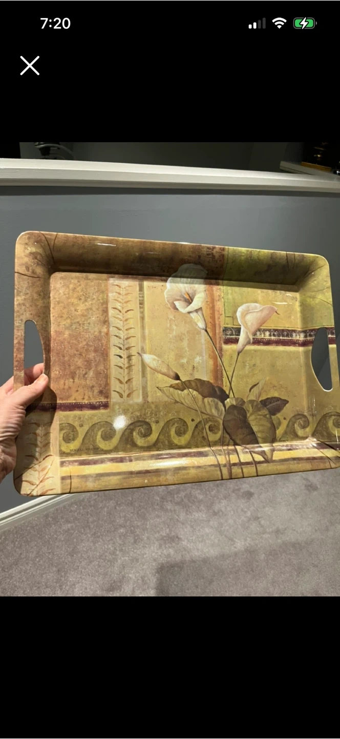 This decorative serving tray features a beautiful print of calla lilies and a textured background. It has built-in handles for easy carrying. Tray measures approximately 16 inches long by 11.5 inches wide.