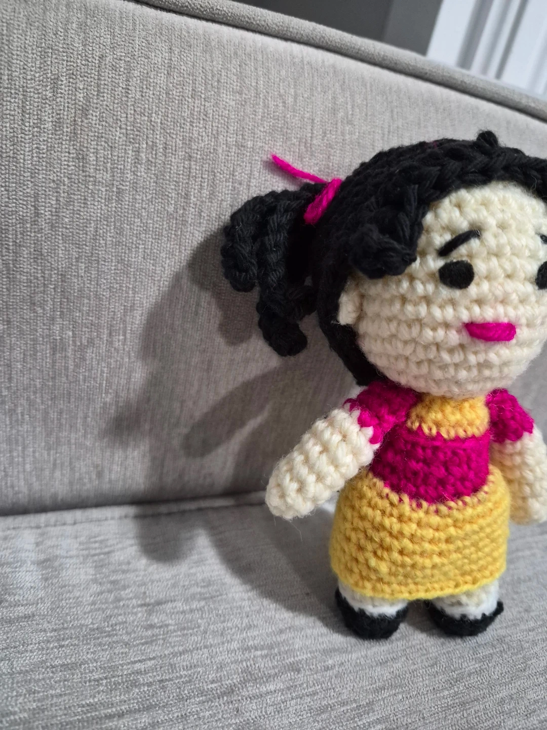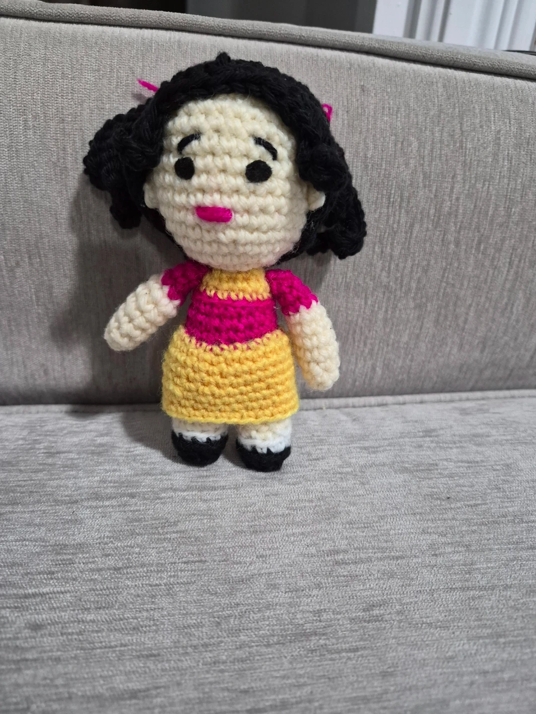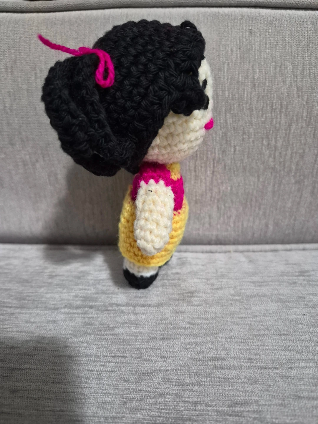 This is a cute handmade crochet doll. It's made of yarn and features black hair with a pink ribbon, a yellow skirt, and a pink and yellow top. Perfect for decorating a shelf or as a small toy!