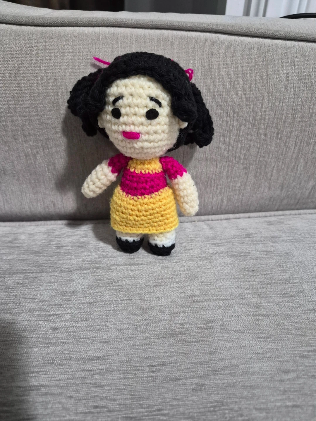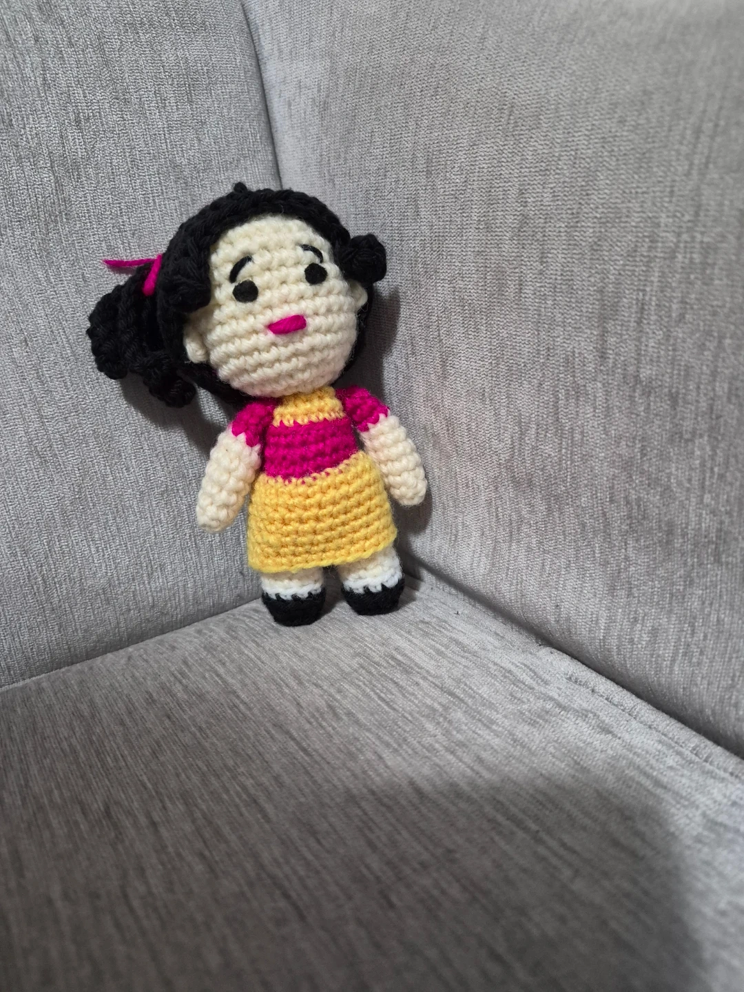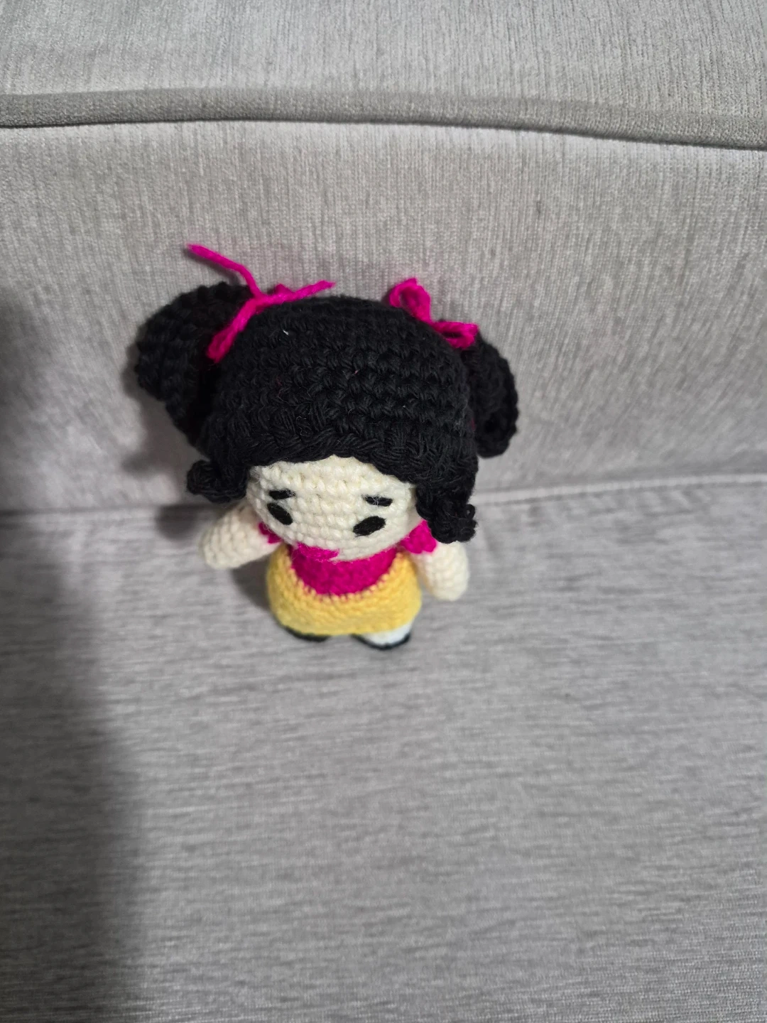 This is a cute handmade crochet doll. It's made of yarn and features black hair with a pink ribbon, a yellow skirt, and a pink and yellow top. Perfect for decorating a shelf or as a small toy!