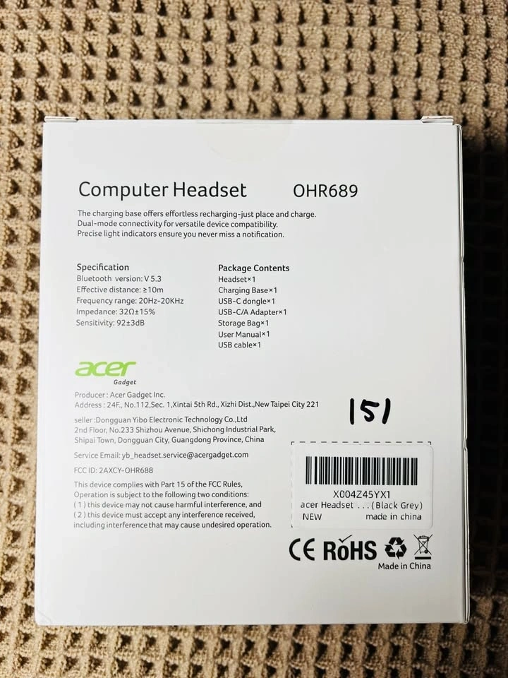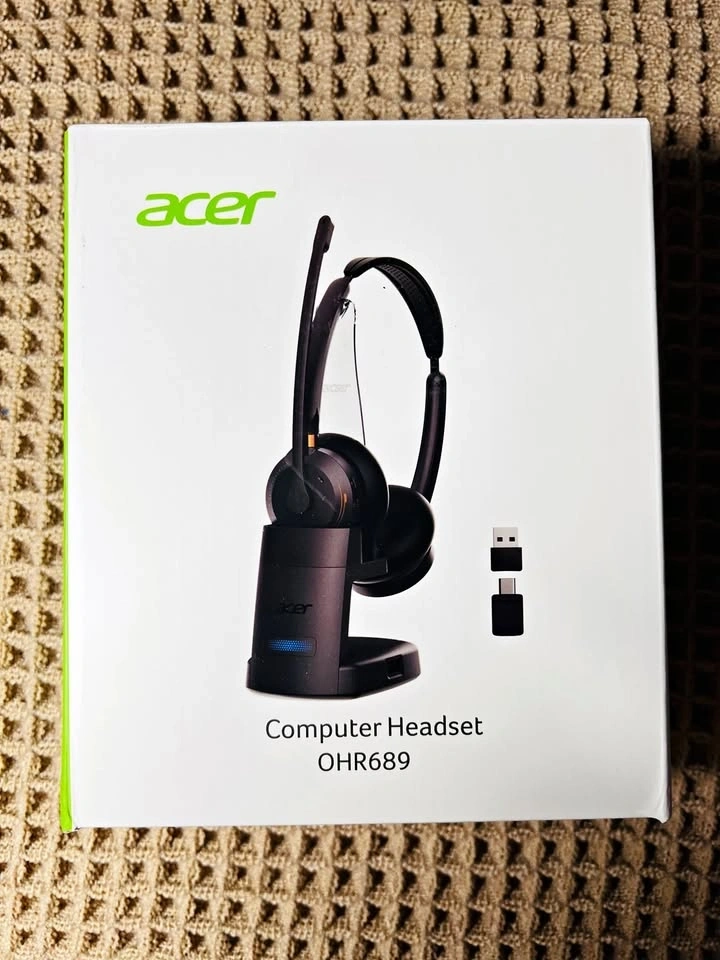 New Acer Computer Headset OHR689. Features Bluetooth version V 5.3 with a 10m effective distance. Includes a charging base for easy recharging and dual-mode connectivity. Color is Black Grey. Package includes headset, charging base, USB-C dongle, USB-C/A adapter, storage bag, user manual, and USB cable.