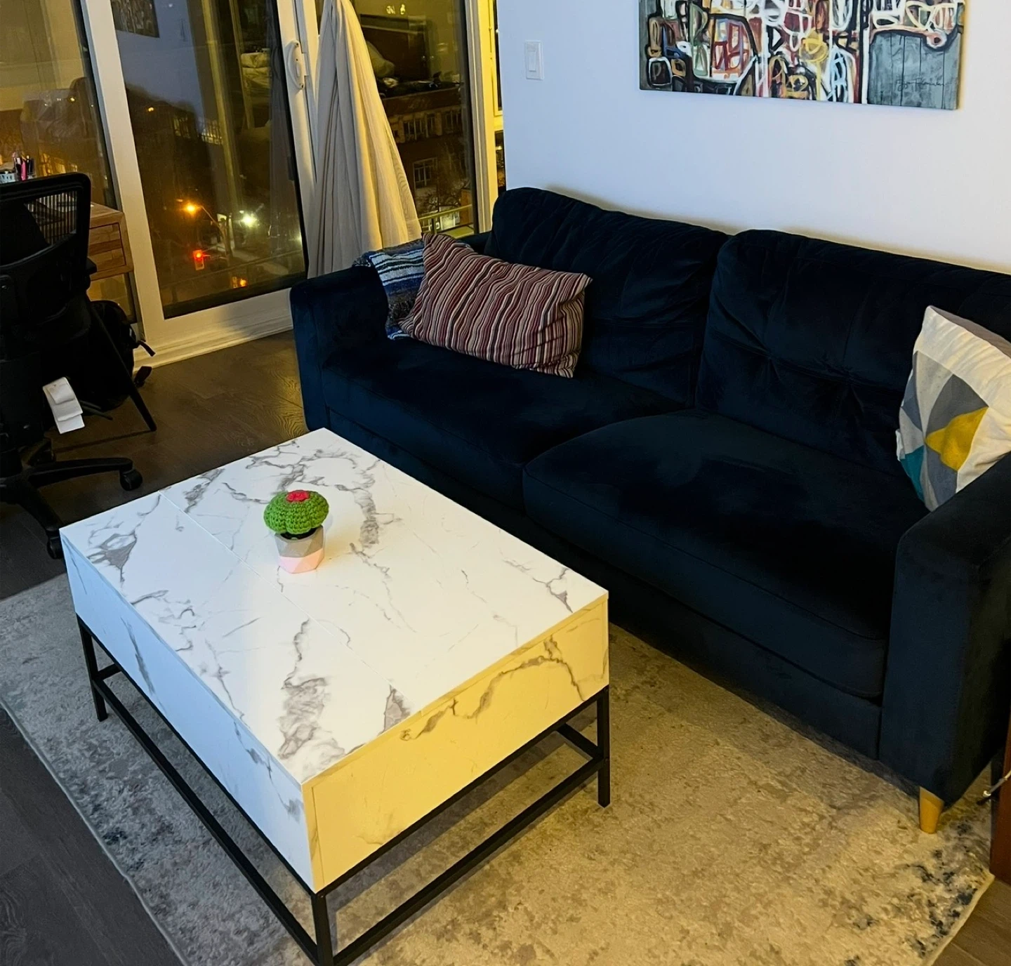This lift-top coffee table offers a modern white marble look with a convenient lifting mechanism. It's great for enjoying meals or working from your couch. Plenty of storage space is hidden inside!
