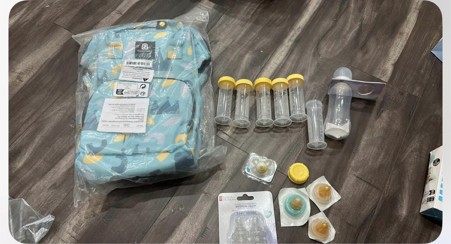 This set includes several baby bottles, nipples, a pacifier, and storage containers. It also comes with a cute diaper bag. Great for feeding on the go and much more baby things
