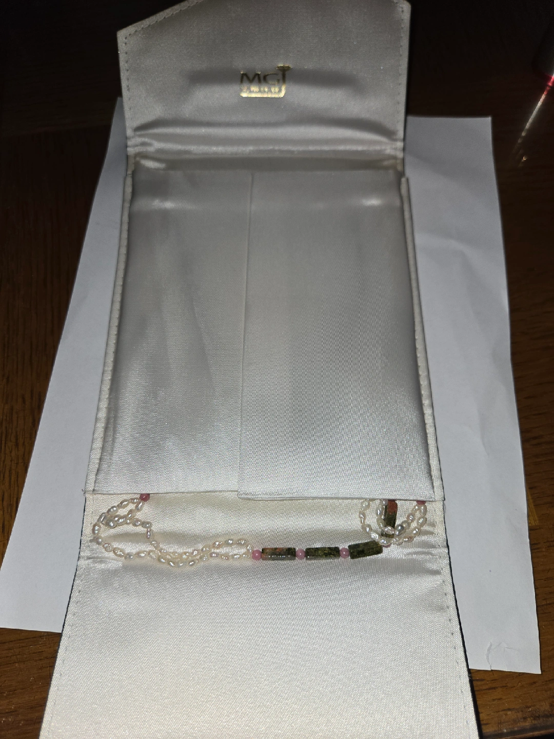 Selling a beautiful 34-inch fresh water pearl necklace with Unikite, Rhodolite, and crafted Serpentine. It comes in its original box!