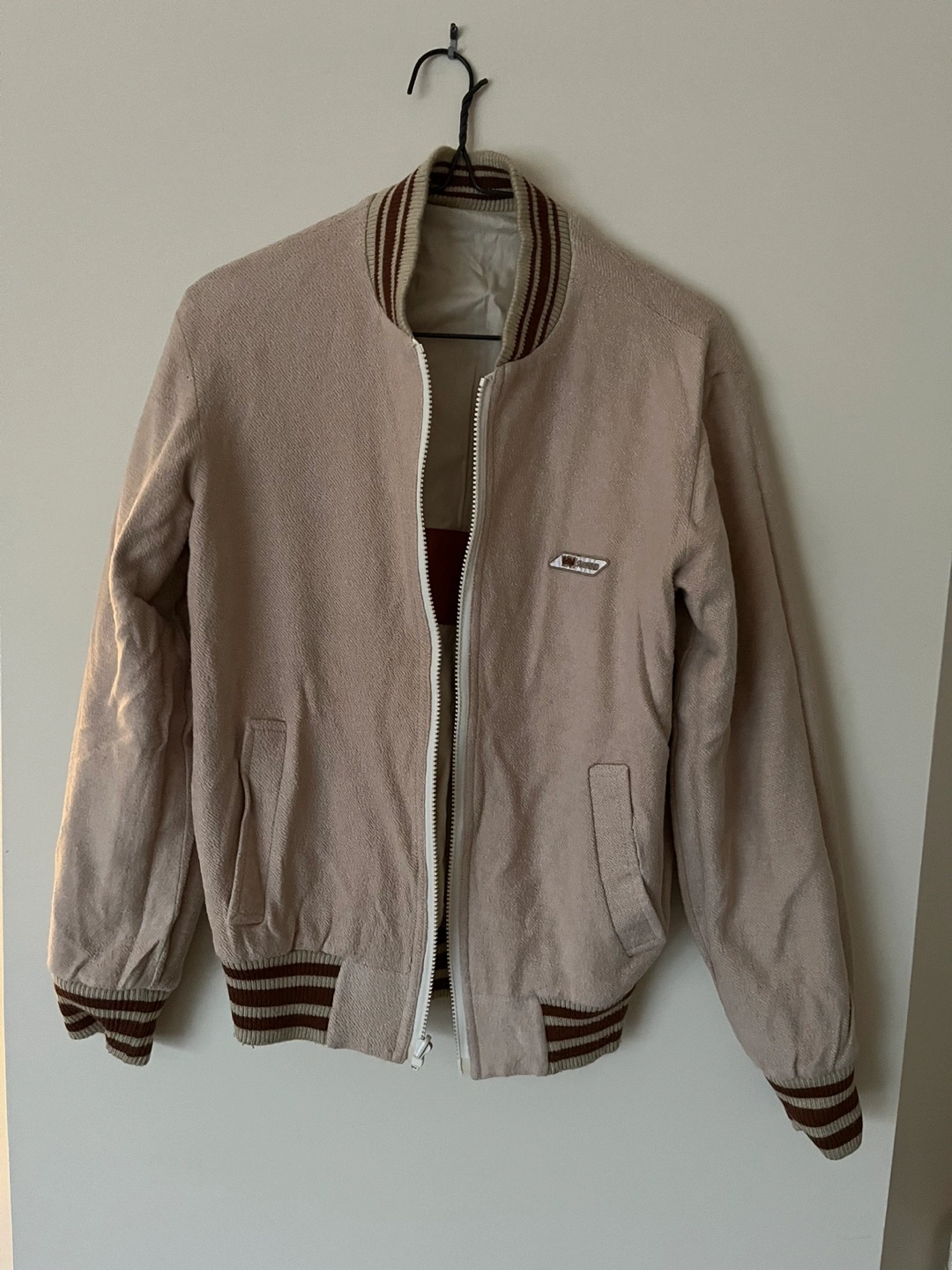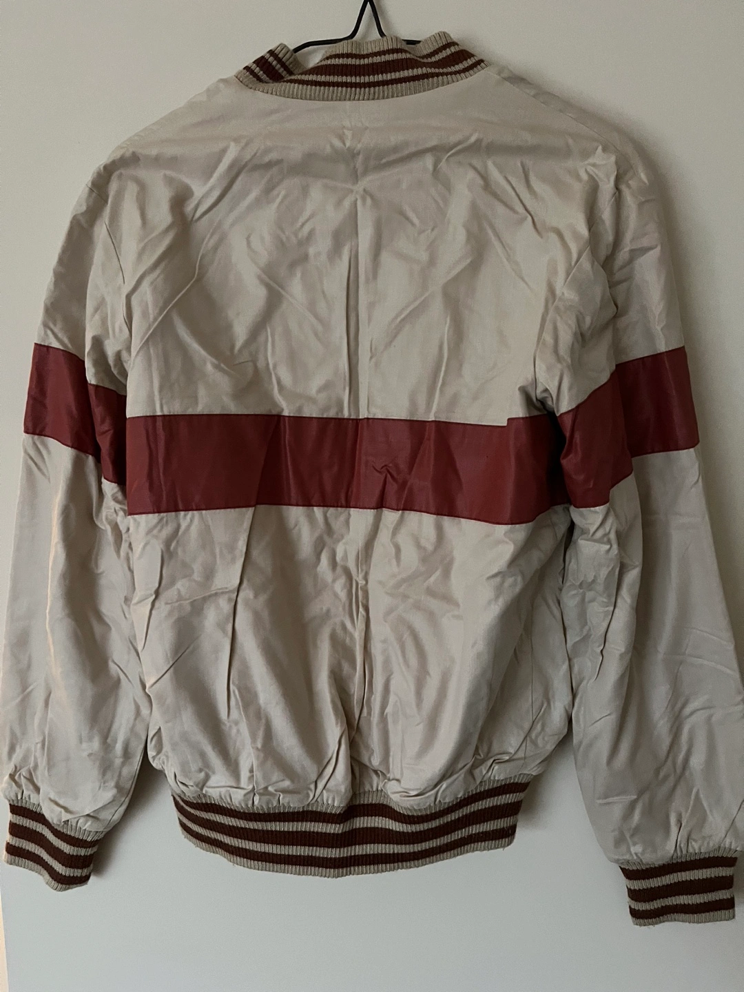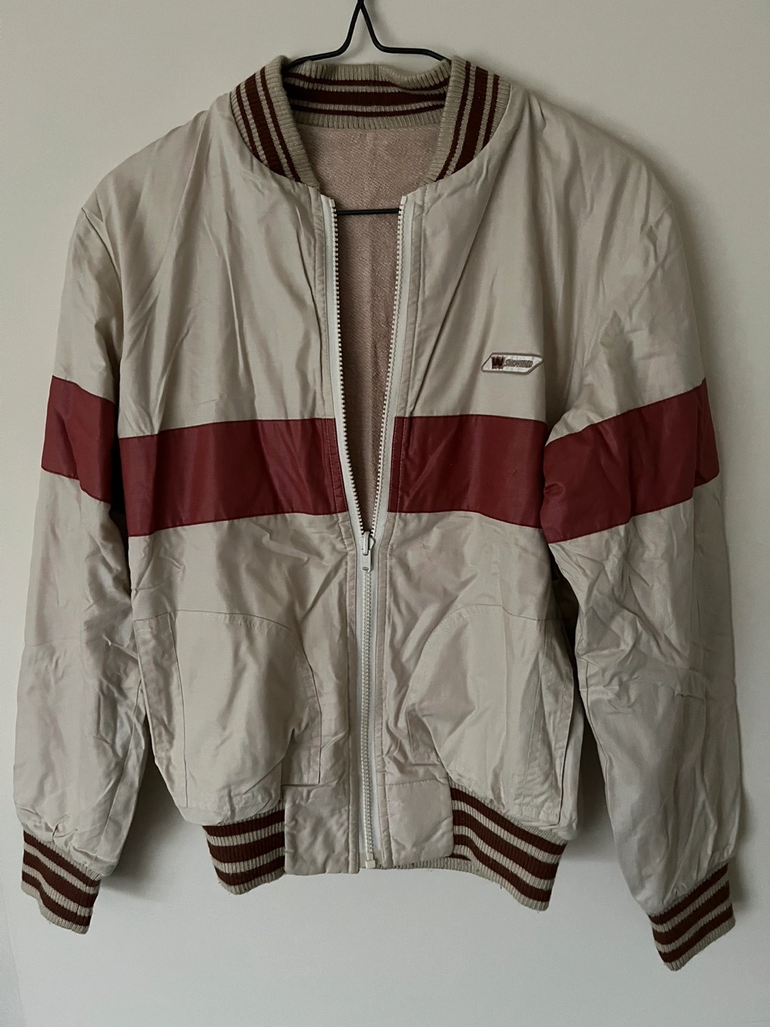 Reversible beige bomber jacket with red and brown stripes. Zipper closure. Fully lined. Size Small. Like new and never worn.