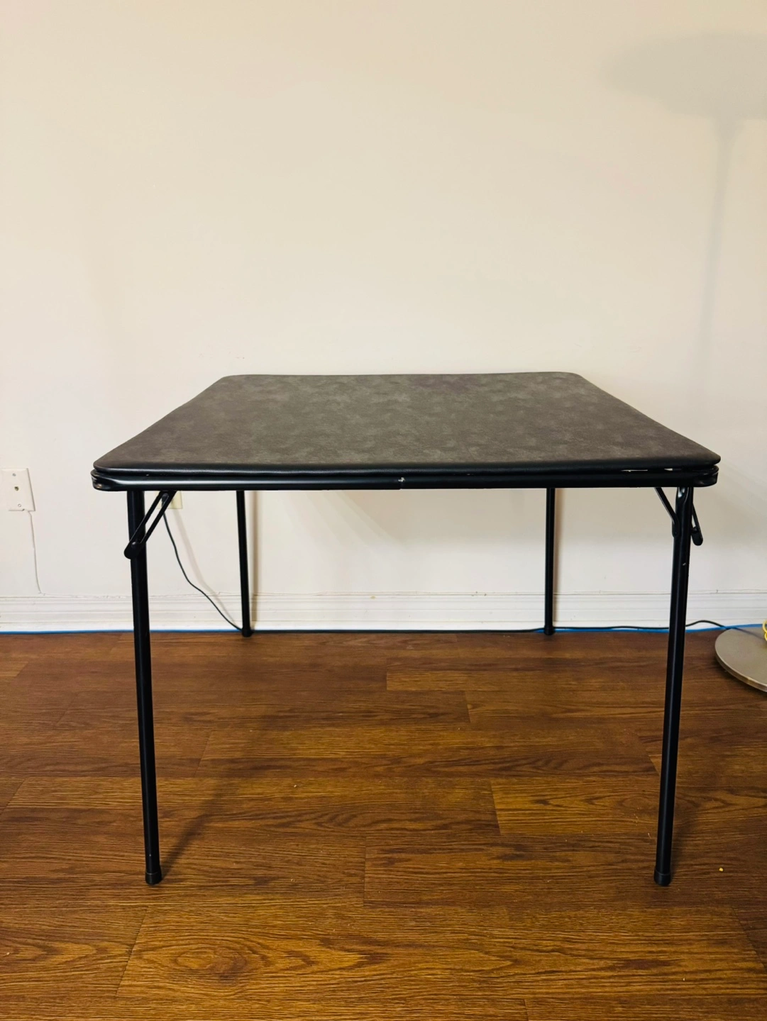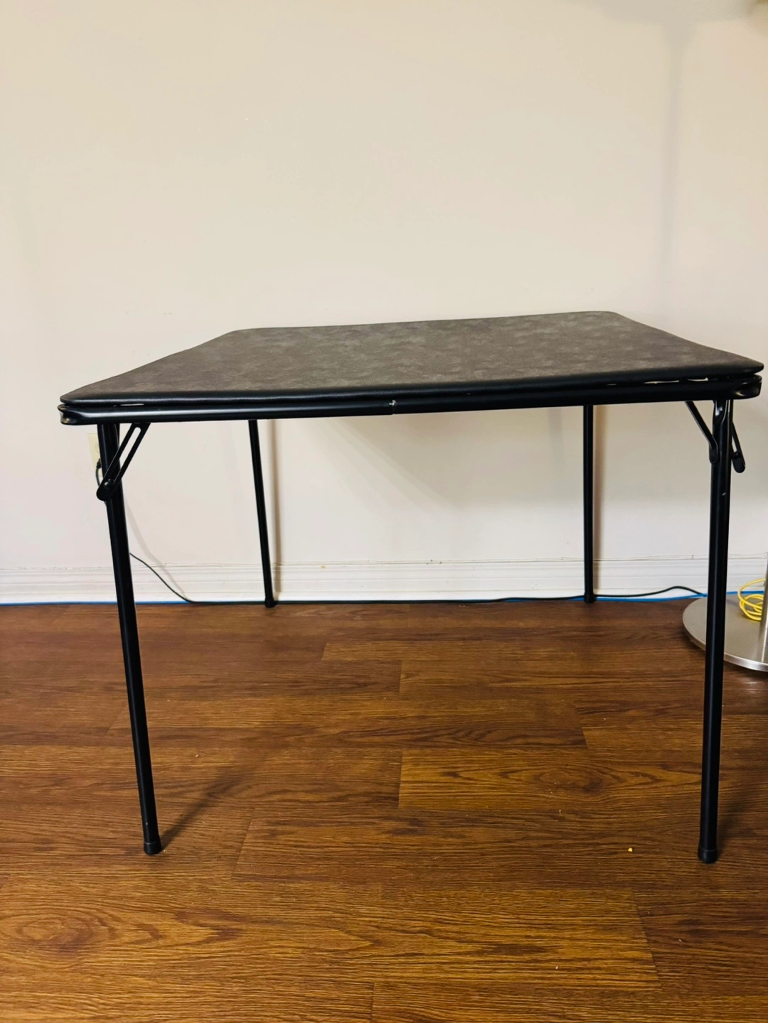Black foldable table, good for small spaces or for taking to events. Has a black vinyl top. Folds in half for storage.