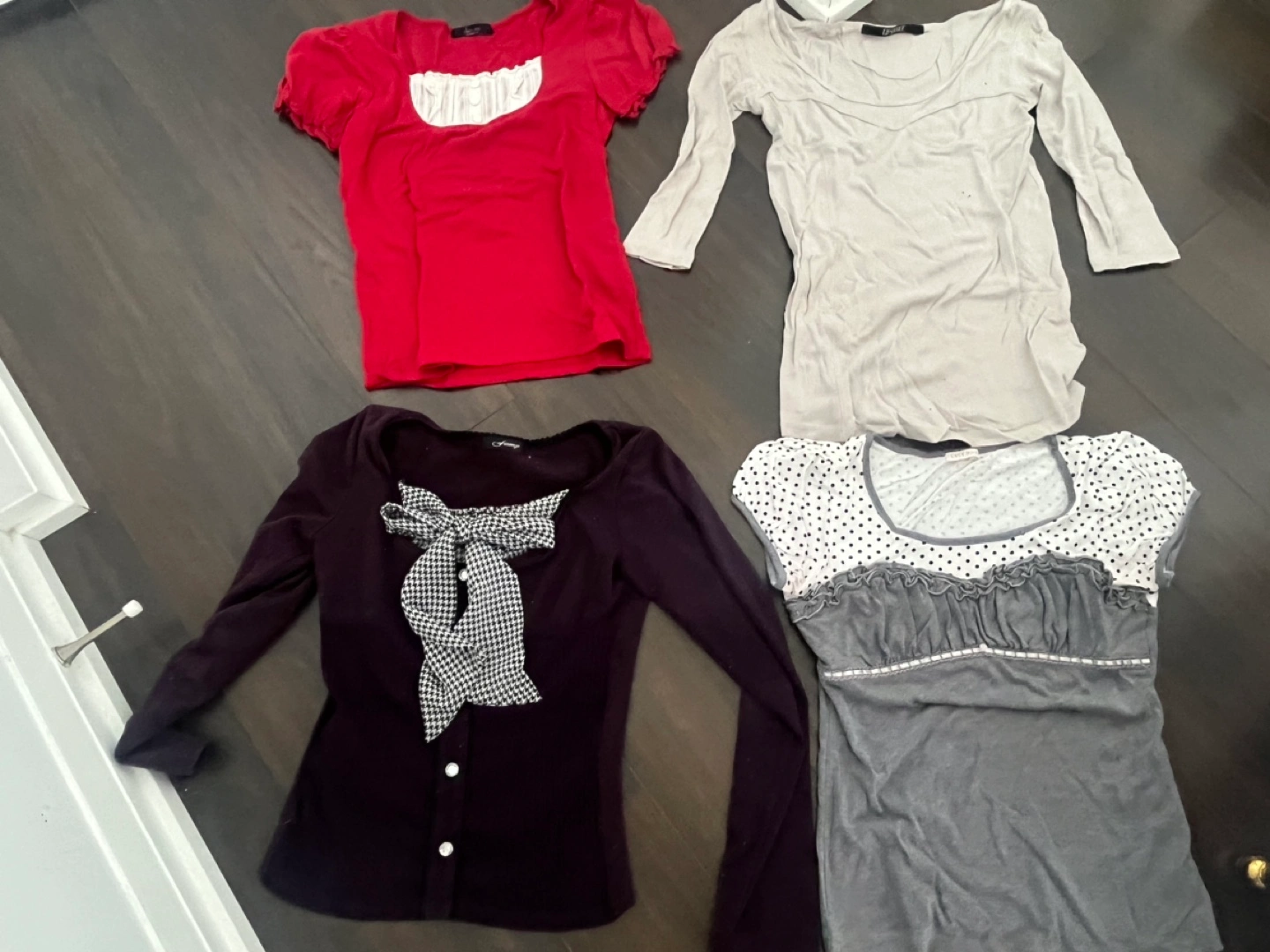 Bundle of 4 tops. All size small. One red, one white, one grey, and one black with a bow.