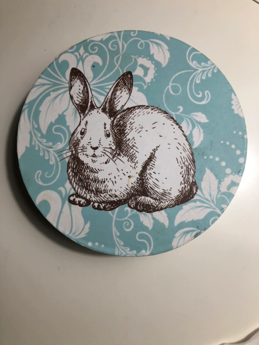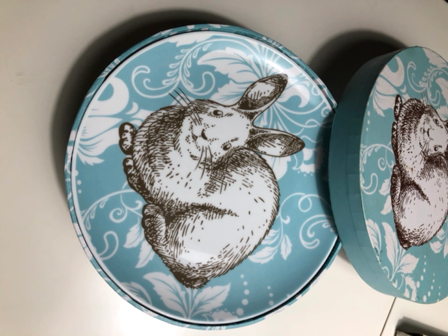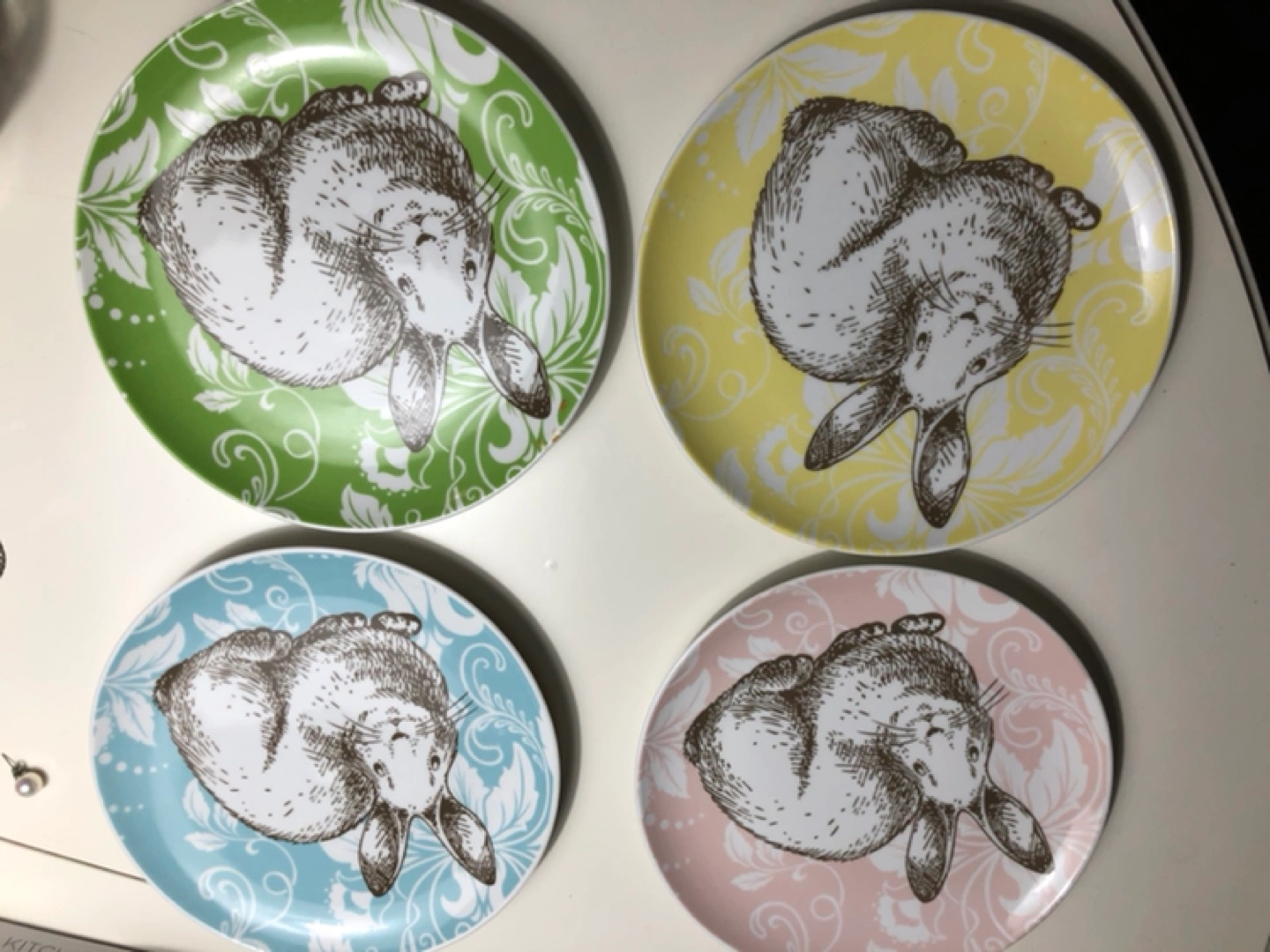 Set of four dessert plates featuring a cute bunny design. Each plate is a different colour, with a blue, green, yellow, and pink background. They are in excellent condition.
