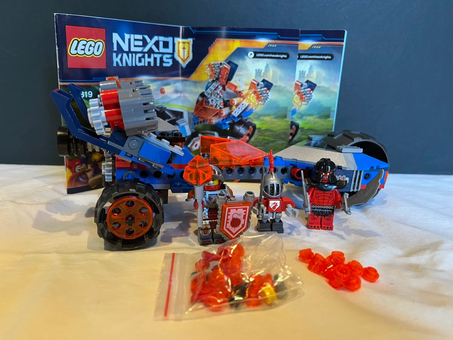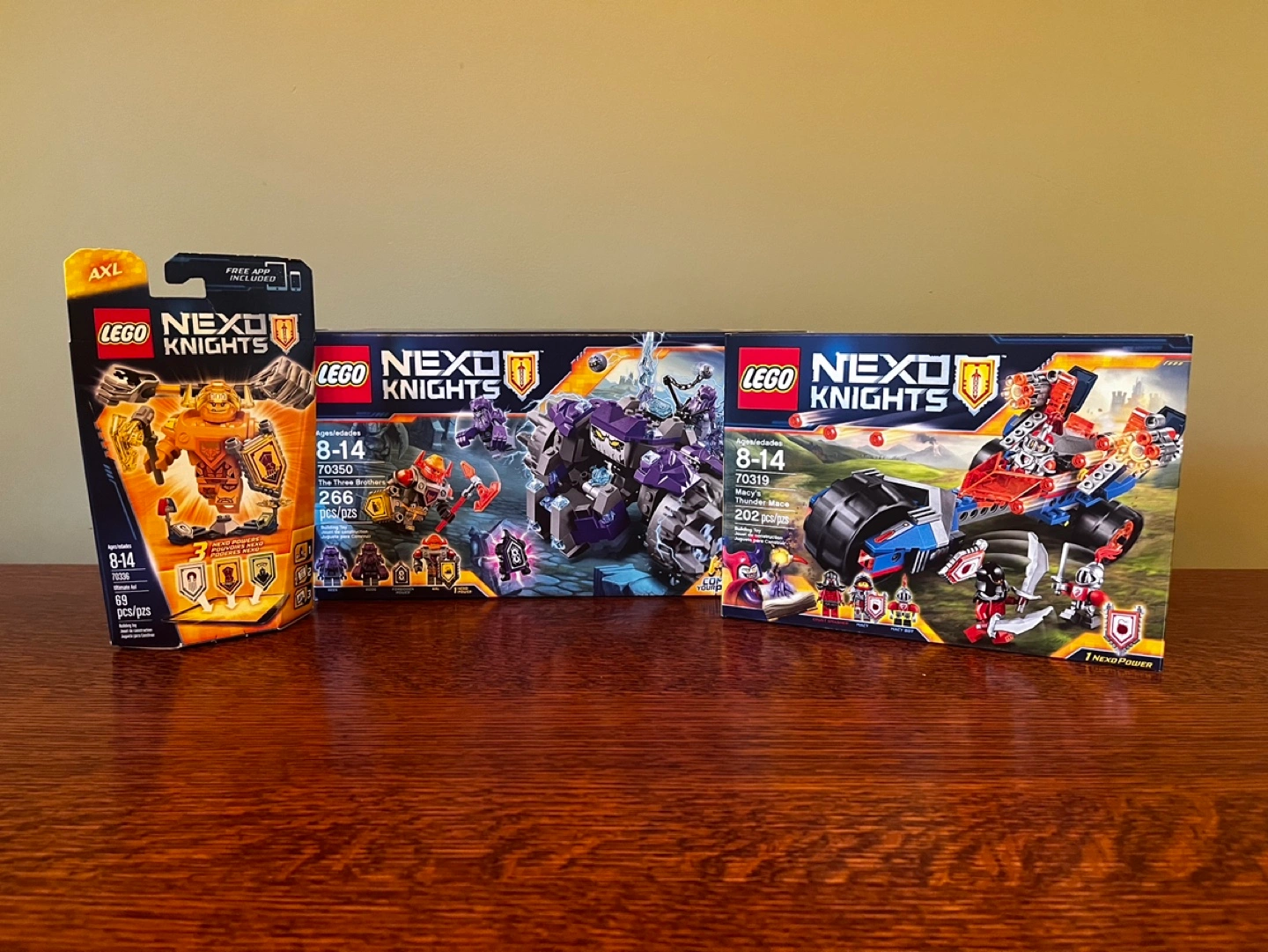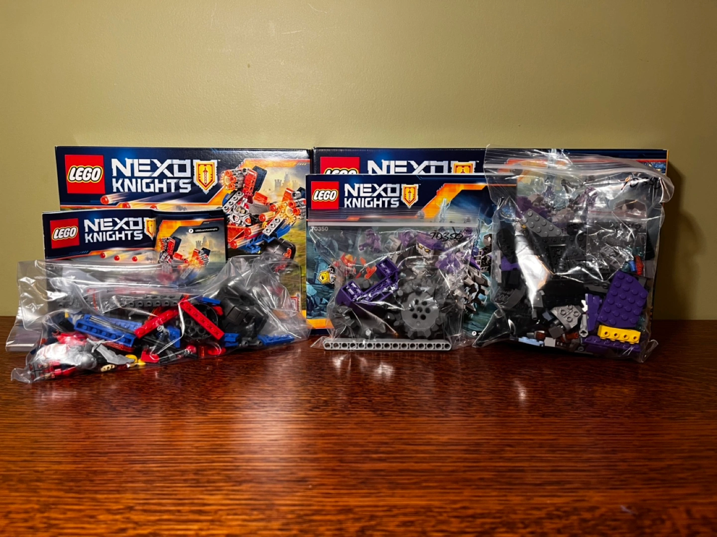 All sets are used – they've been built once or twice but are in excellent, like new condition. Some of the pieces may be a bit dusty from sitting on display but they are not scratched or worn. All 3 sets for $30 70319 Nexo Knights: Macy’s Thunder Mace (202 pieces) 70336 Nexo Knights: Ultimate Axl (69 pieces) 70350 Nexo Knights: The Three Brothers (266 pieces) The sets include all pieces (including minifigures), the original box and instructions, and the 'extra' small pieces. Where included, the stickers are attached to the bricks. Pieces are stored in ziplock bags in the original retail box. Looking for more LEGO? Check my other listings for Star Wars, Super Heroes, Ninjago, Chima, NEXO Knights, Mixels, and more LEGO.