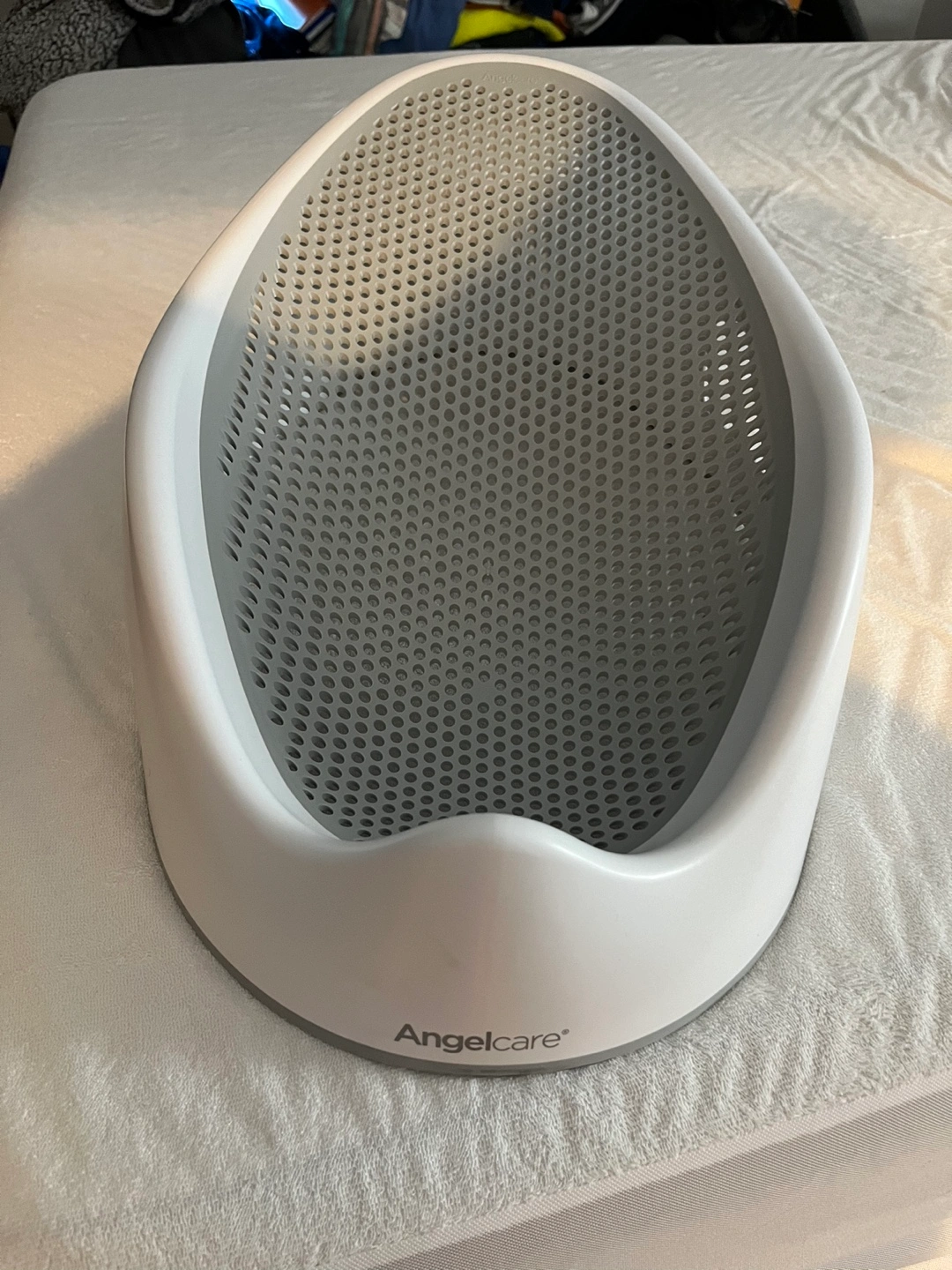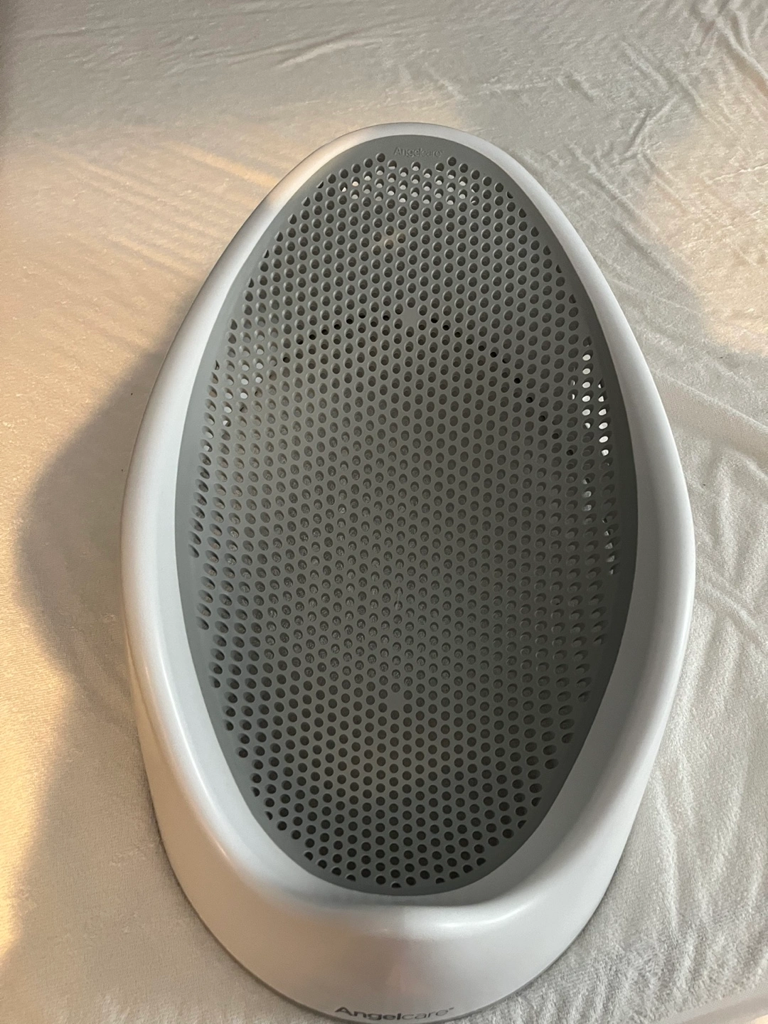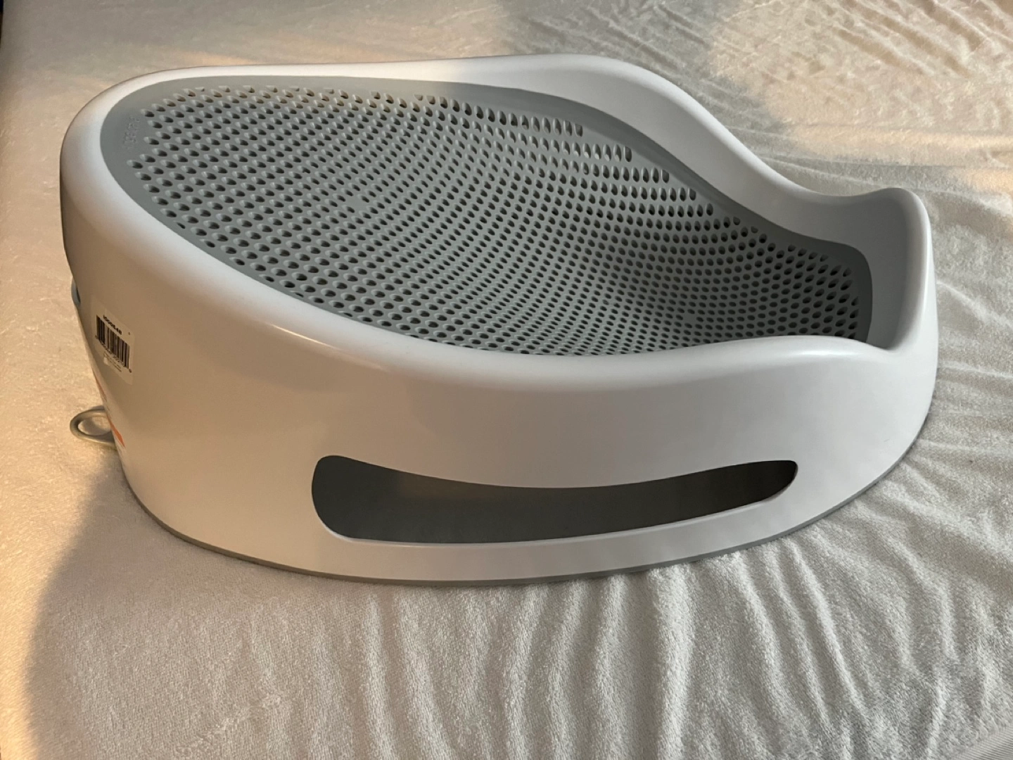Grey and white baby bath tub. It has a mesh bottom and two handles on the side. A great investment! If my little one hadn’t outgrown it I wouldn’t sell it!