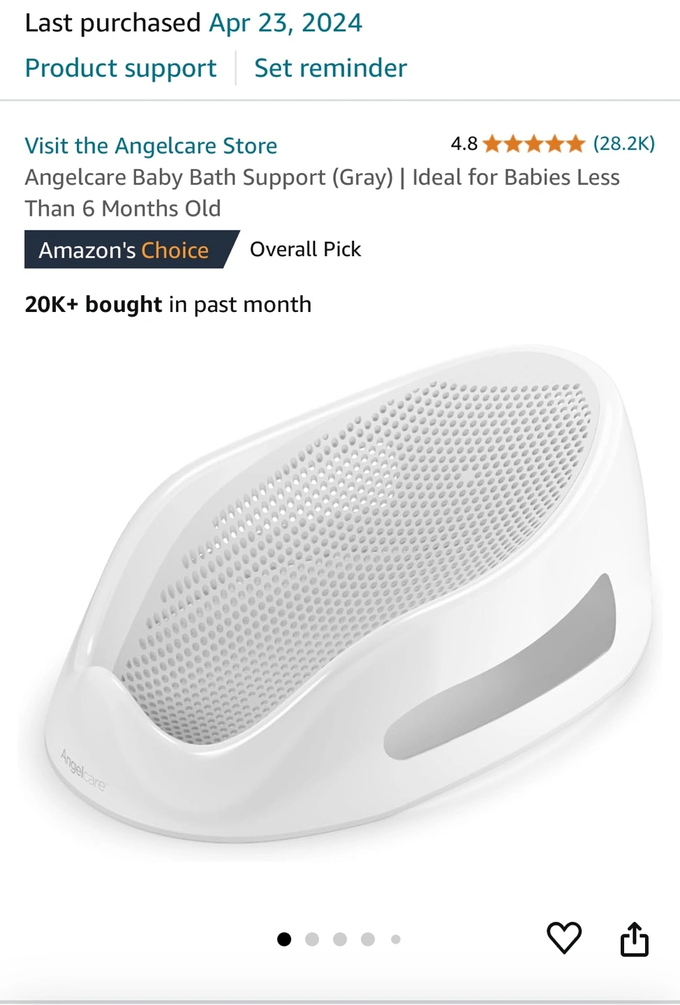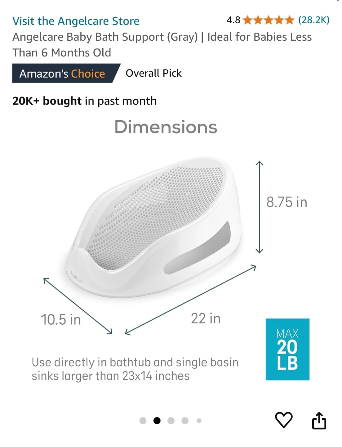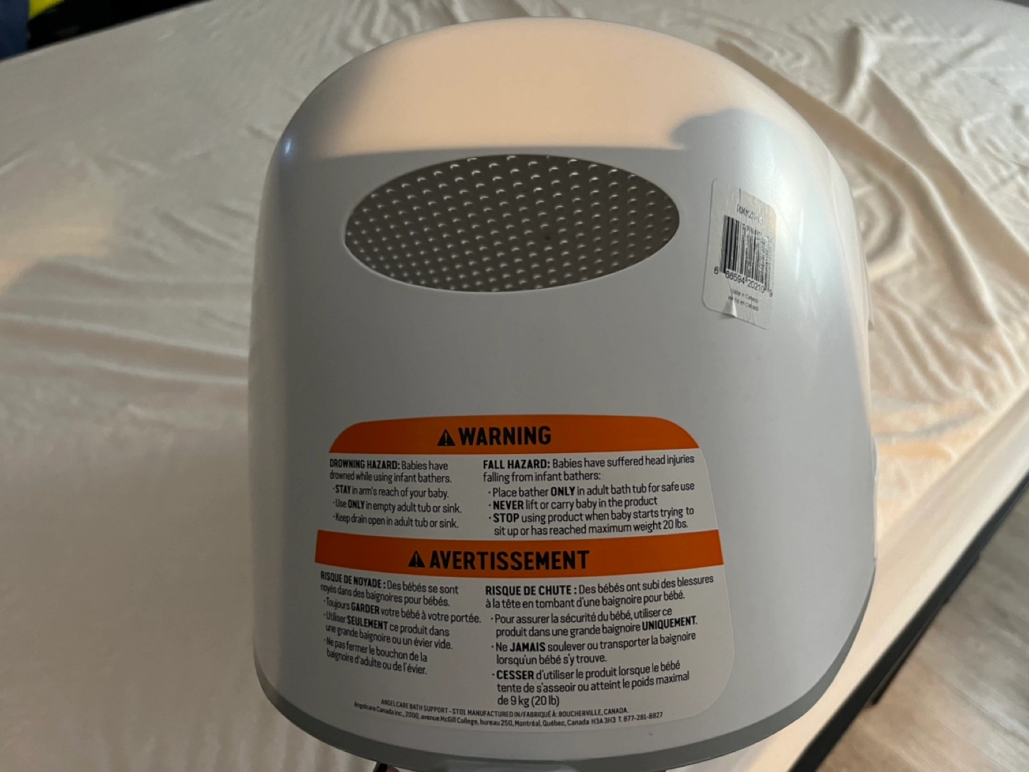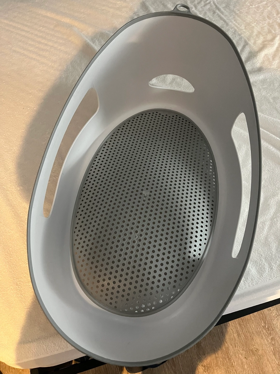 Grey and white baby bath tub. It has a mesh bottom and two handles on the side. A great investment! If my little one hadn’t outgrown it I wouldn’t sell it!
