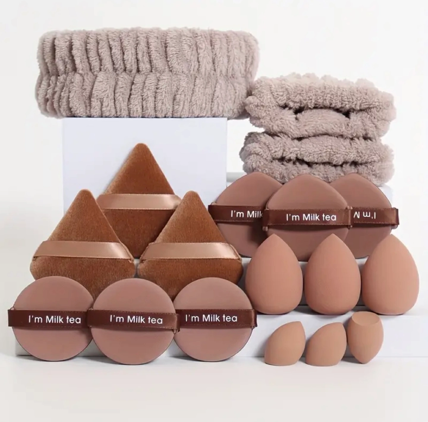 31 pcs makeup sponge set with a variety of shapes and sizes. Includes headbands and wristbands. Comes with makeup brushes.