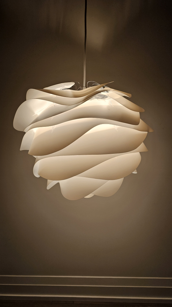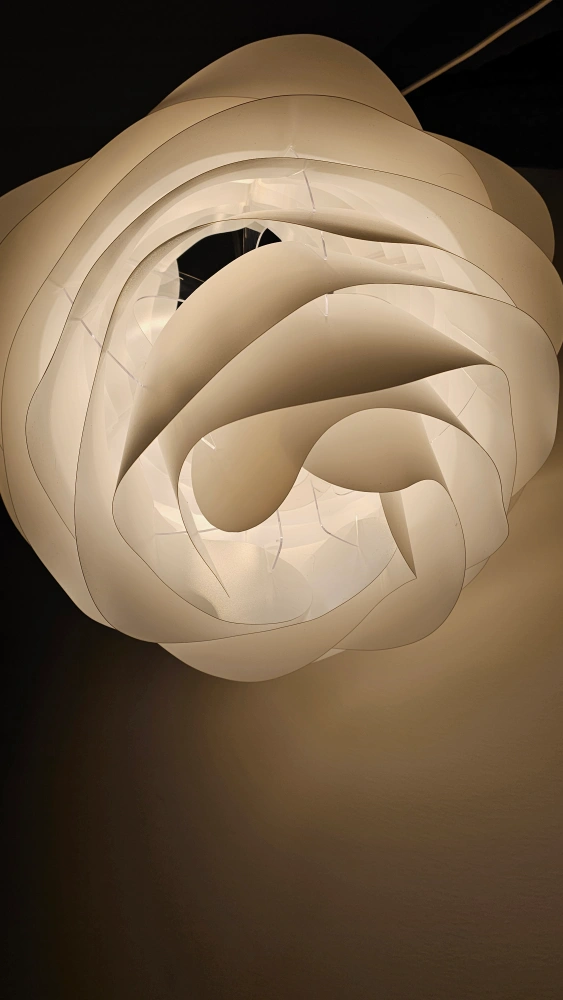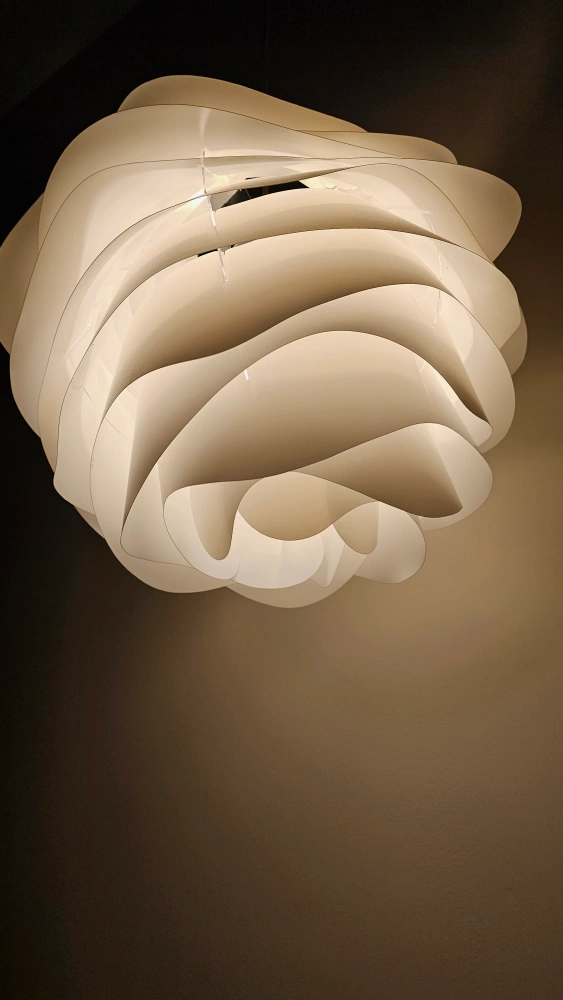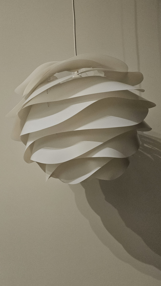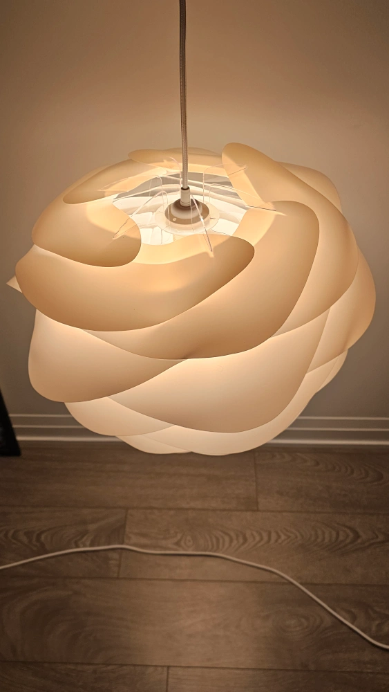 White pendant light fixture, layers of overlapping plastic. Modern design. Includes cord and bulb.