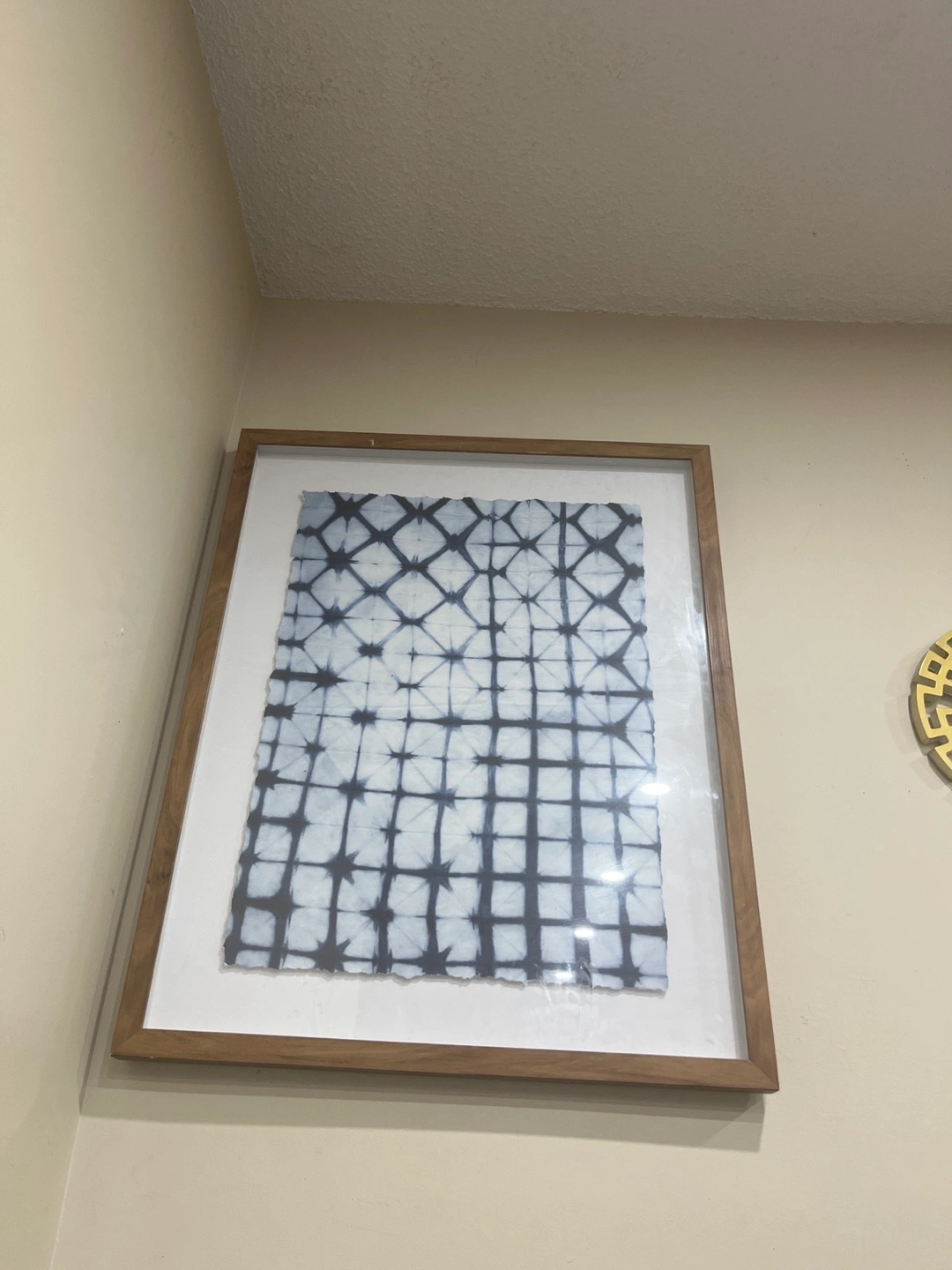 78Framed artwork with tie dye design in shades of blue. Simple wooden frame.