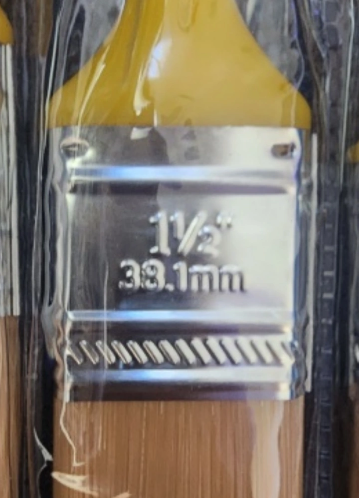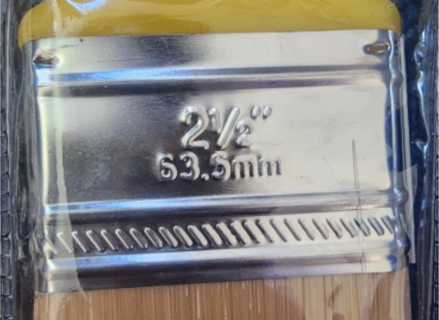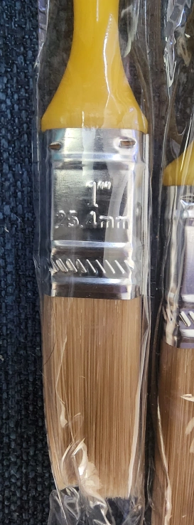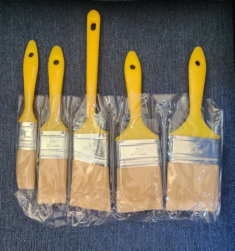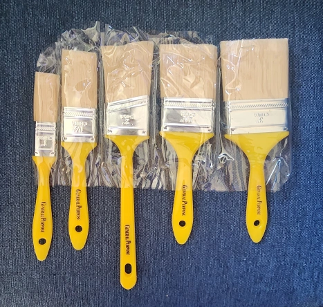 Set of six paint brushes in various sizes. All new and unused. The largest brush is 2.5 inches wide. Brushes have yellow plastic handles.