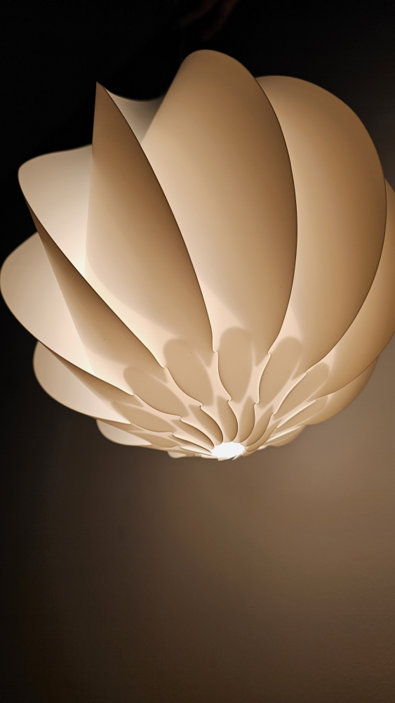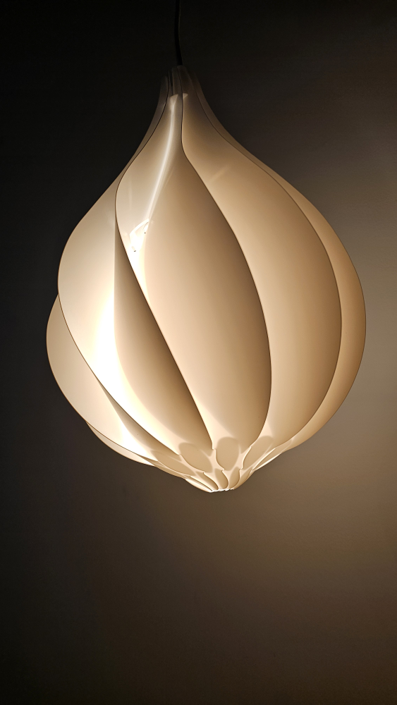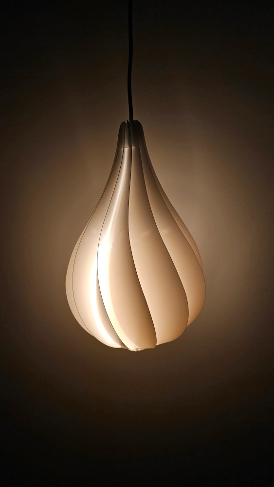 White pendant light with a unique, modern design. Cord and bulb included.