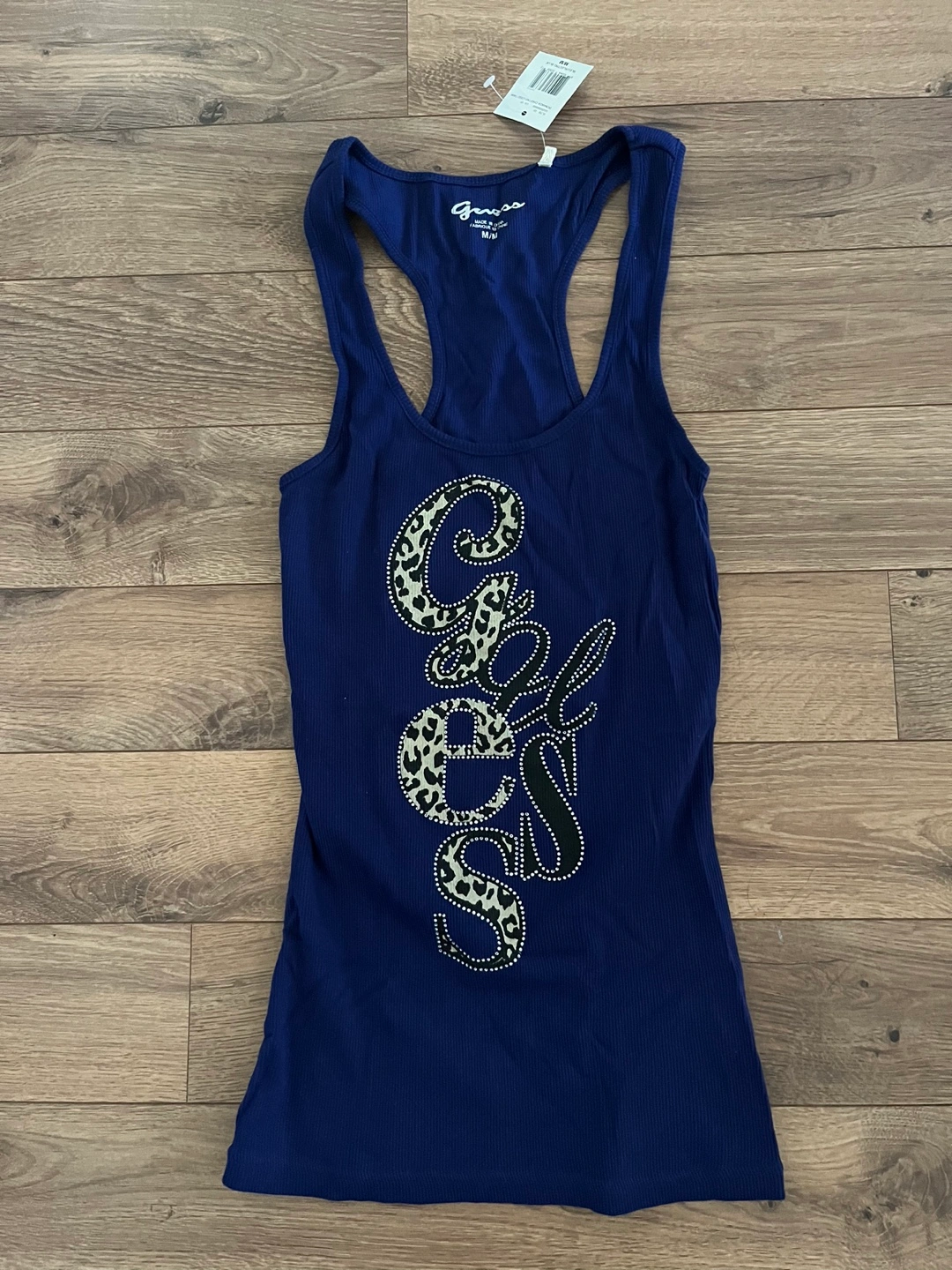 Blue tank top with Guess logo and cheetah print detail. Brand new. Size medium. Pick up Yonge and finch area