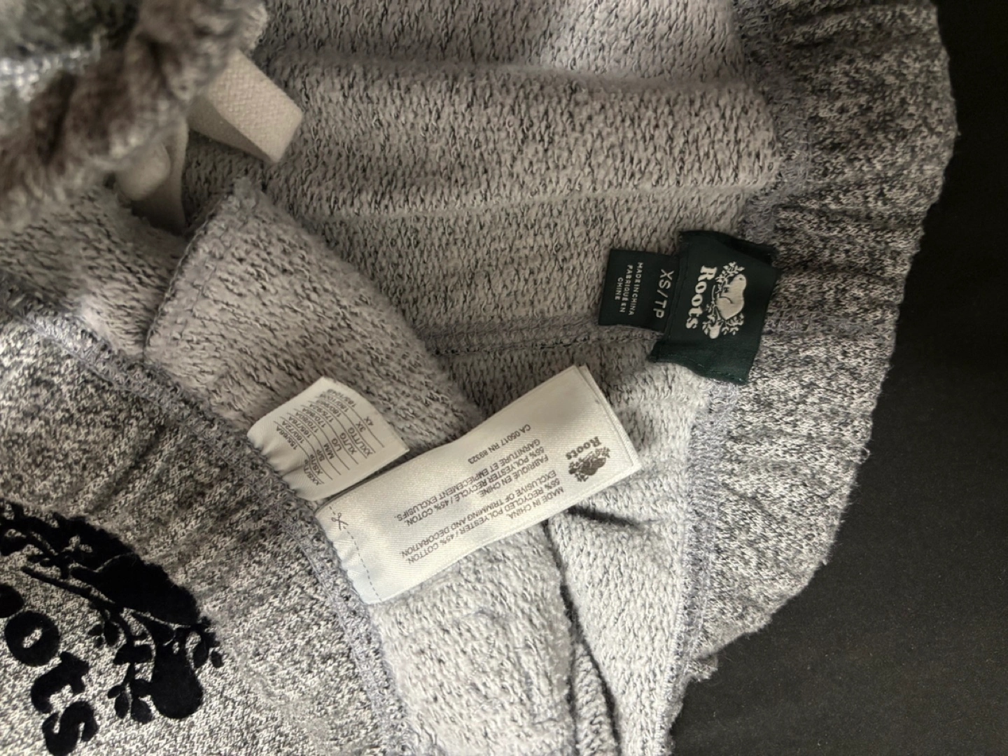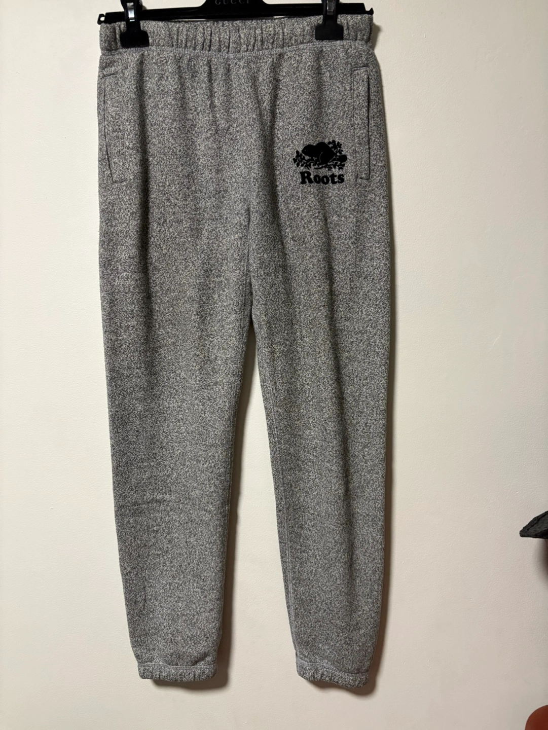 Grey sweatpants with Roots logo. Drawstring waist and cuffed ankles. Size XS men’s, fits like regular small sweatpants