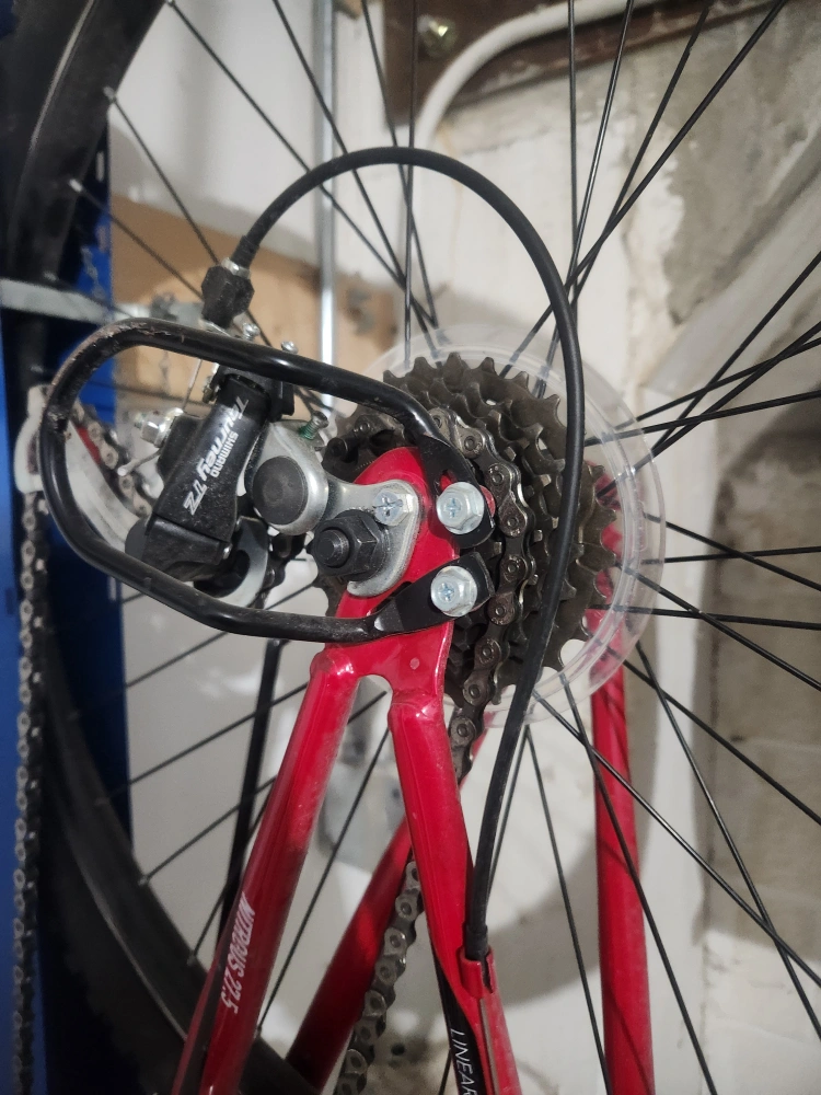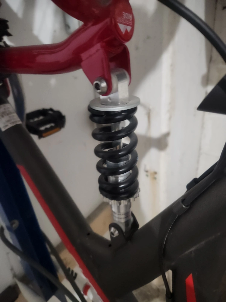 Red mountain bike with duel suspension and linear pull braking system. 27.5 x 1.95 tires.