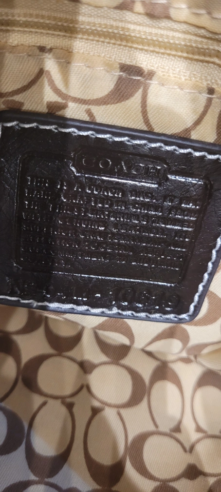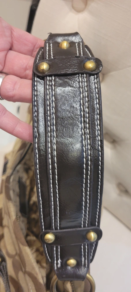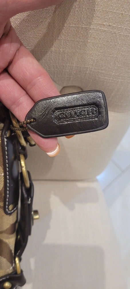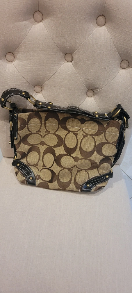 48Pre-loved Coach shoulder bag. Brown leather trim and strap detail. Signature C pattern. This was given as a gift so not sure of authenticity price therefore reflects that It does have creed patch with number but again not sure. In almost new condition