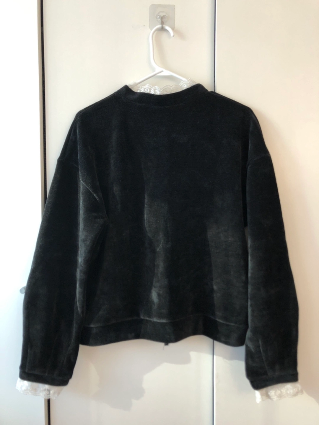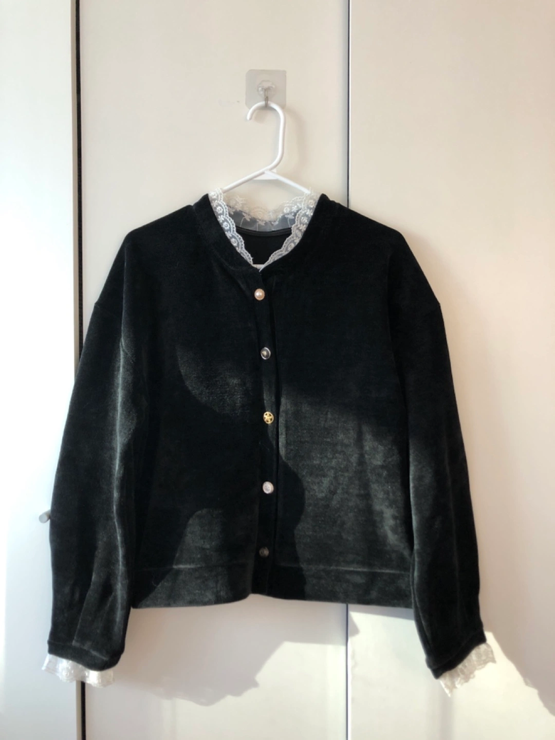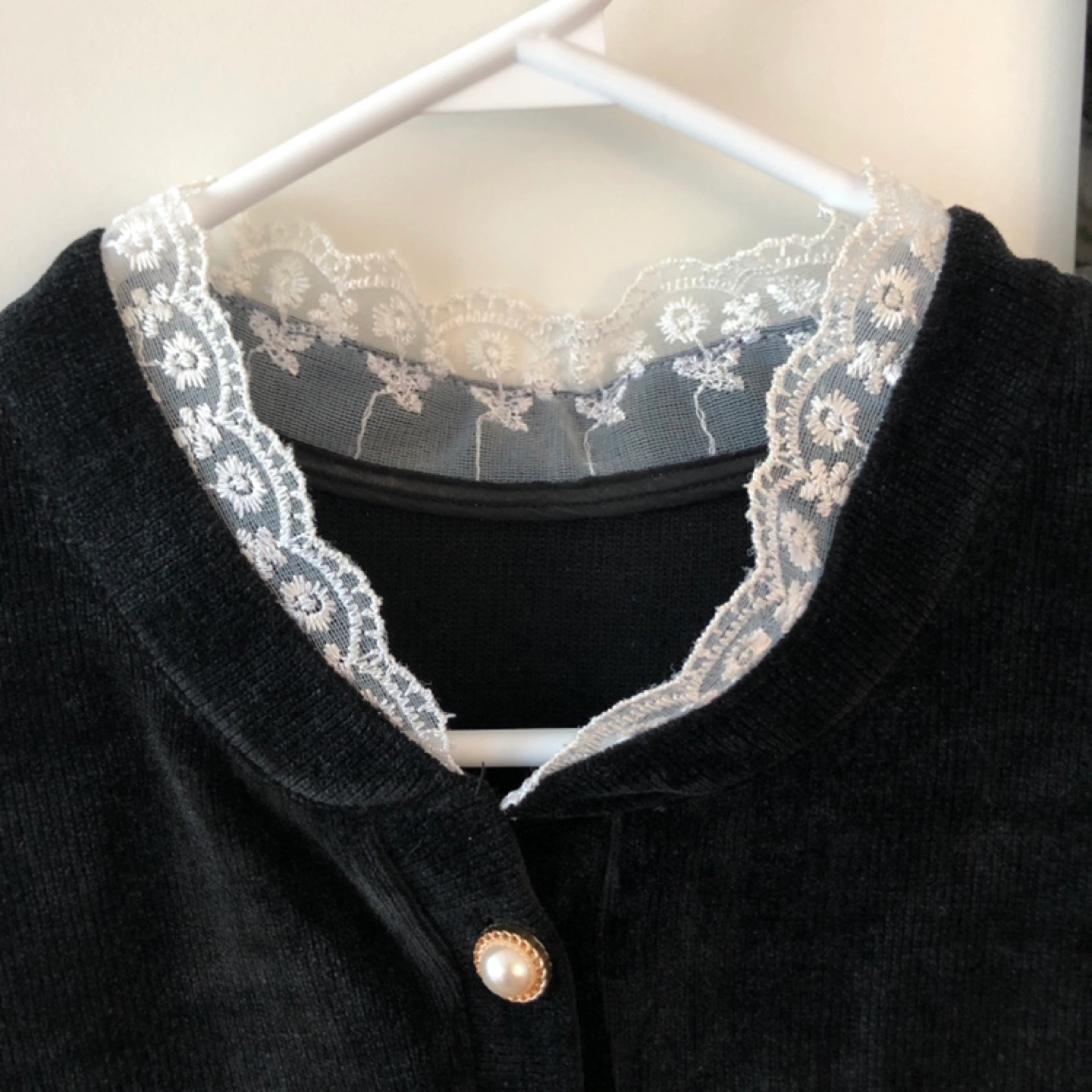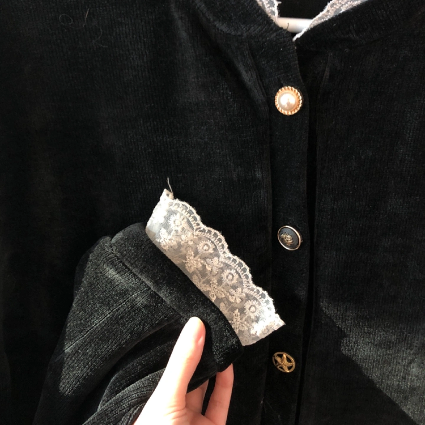 Black velvet cardigan with lace trim around the collar and cuffs. Features 5 different style buttons