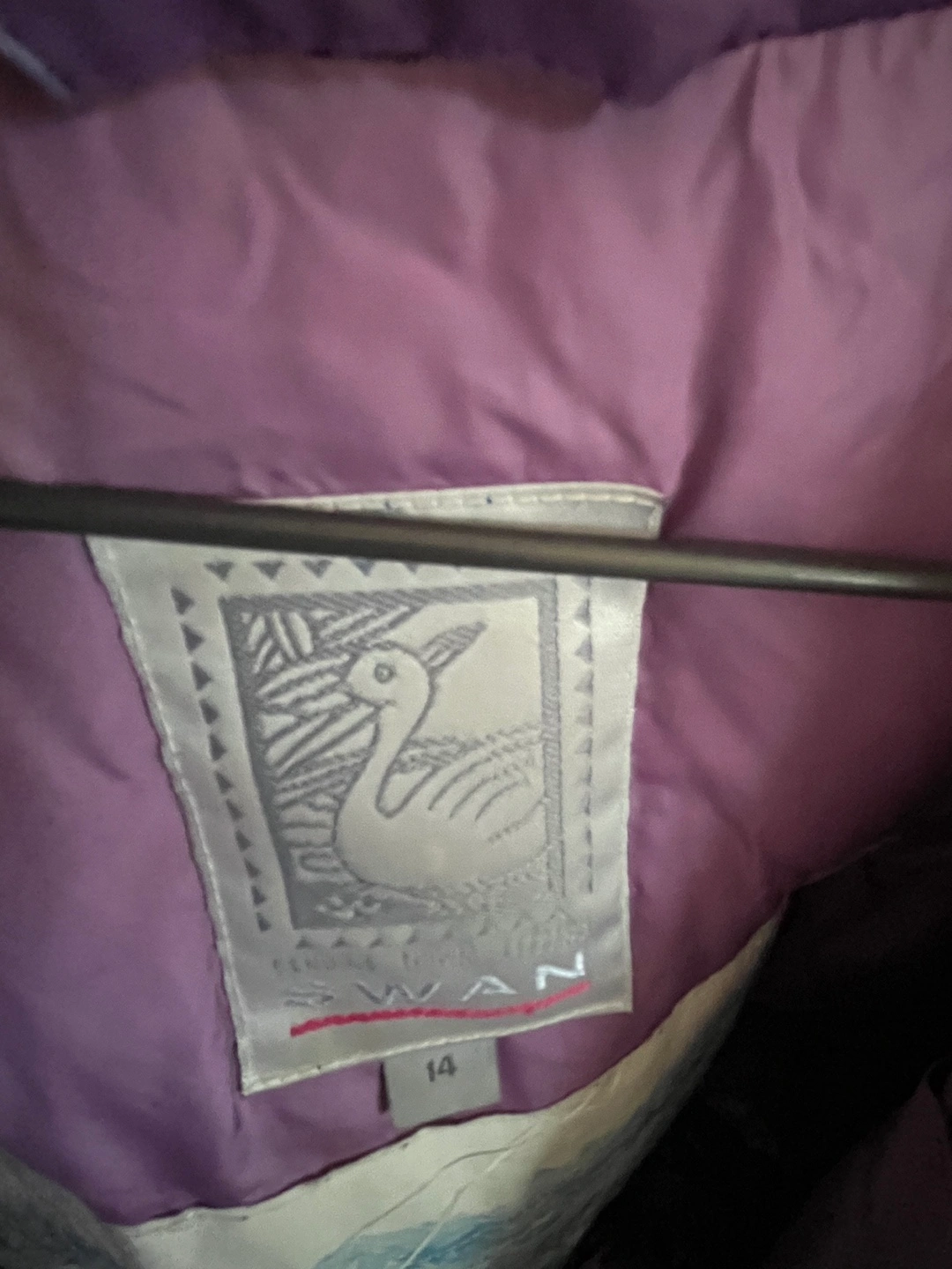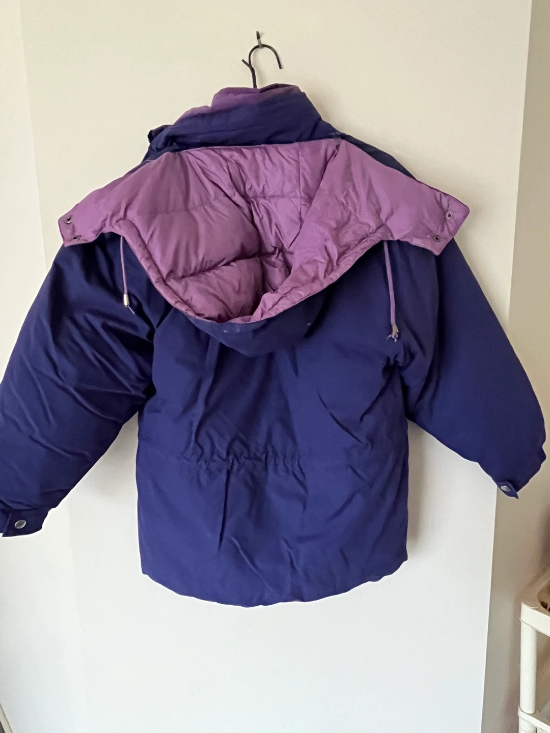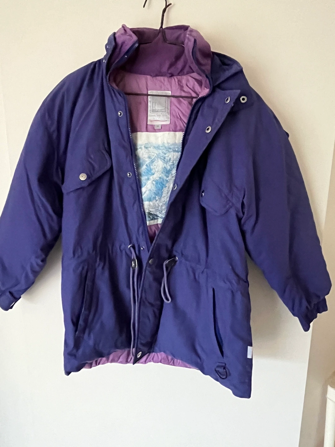 New purple down jacket with a detachable hood. Has a unique inner lining with a mountain scene. Has multiple pockets. Size 14. Warm and genuine down feeling.