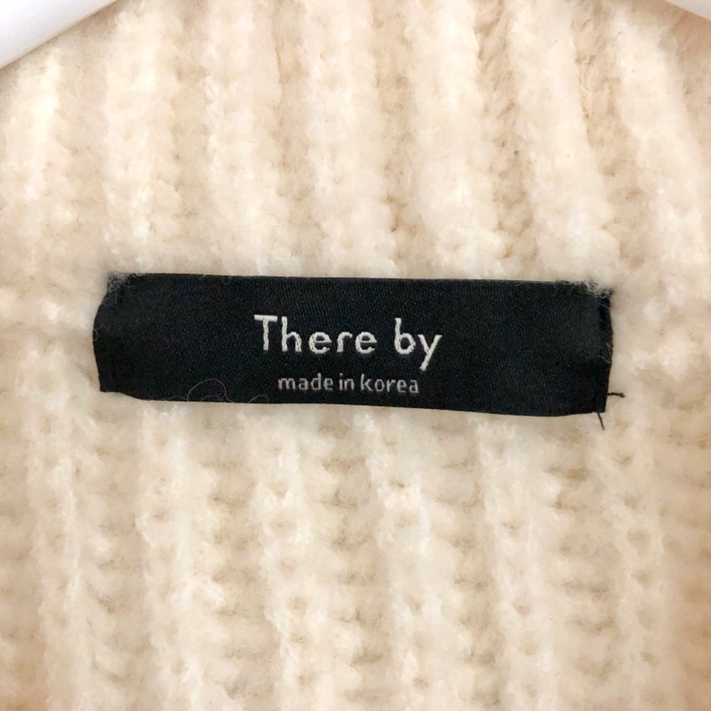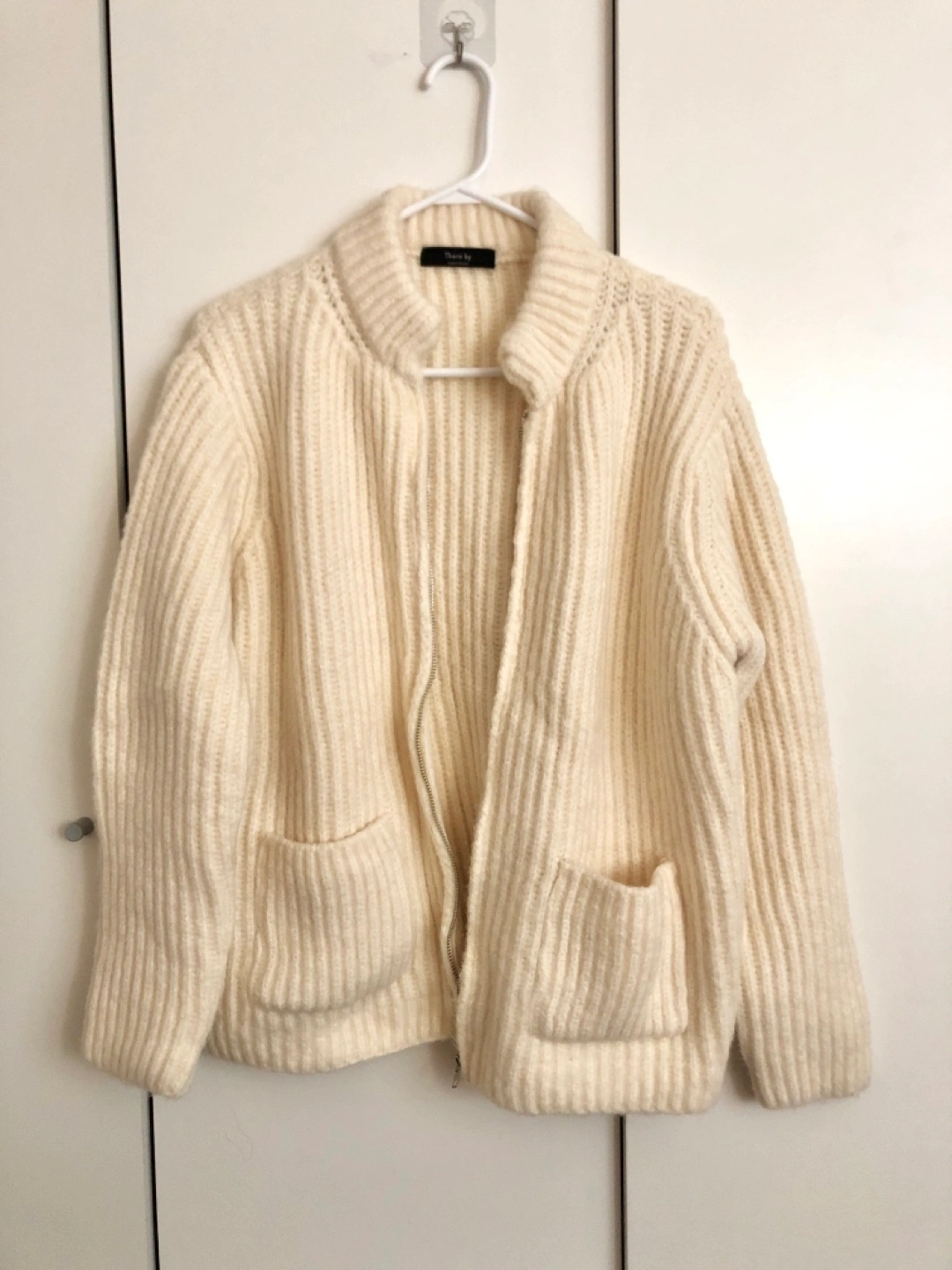 Cream coloured, knitted sweater with a zip-up front. Features two pockets on the front.