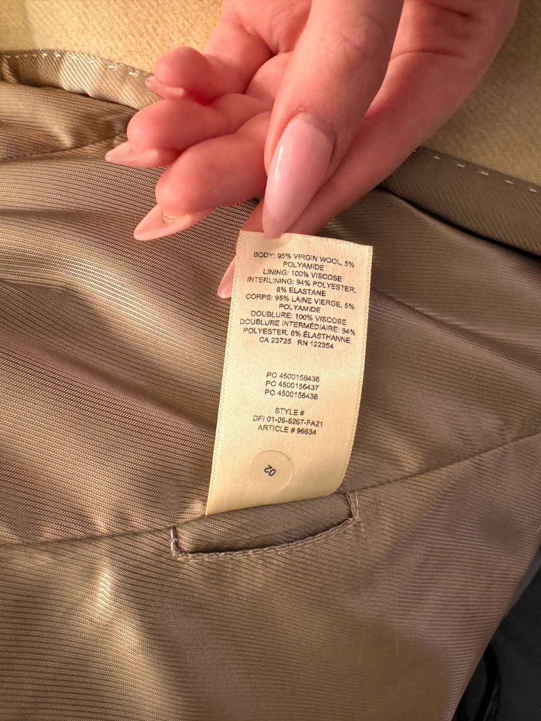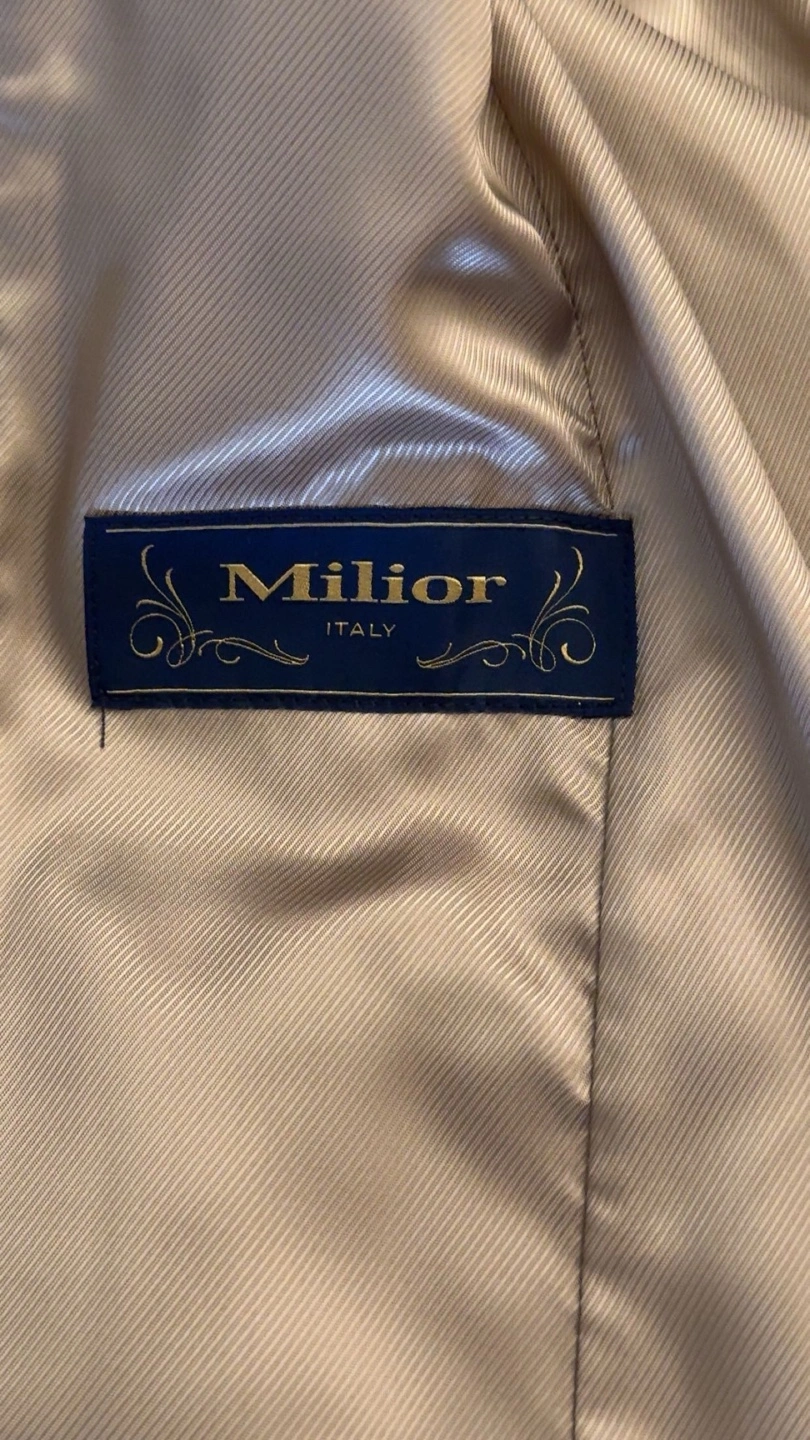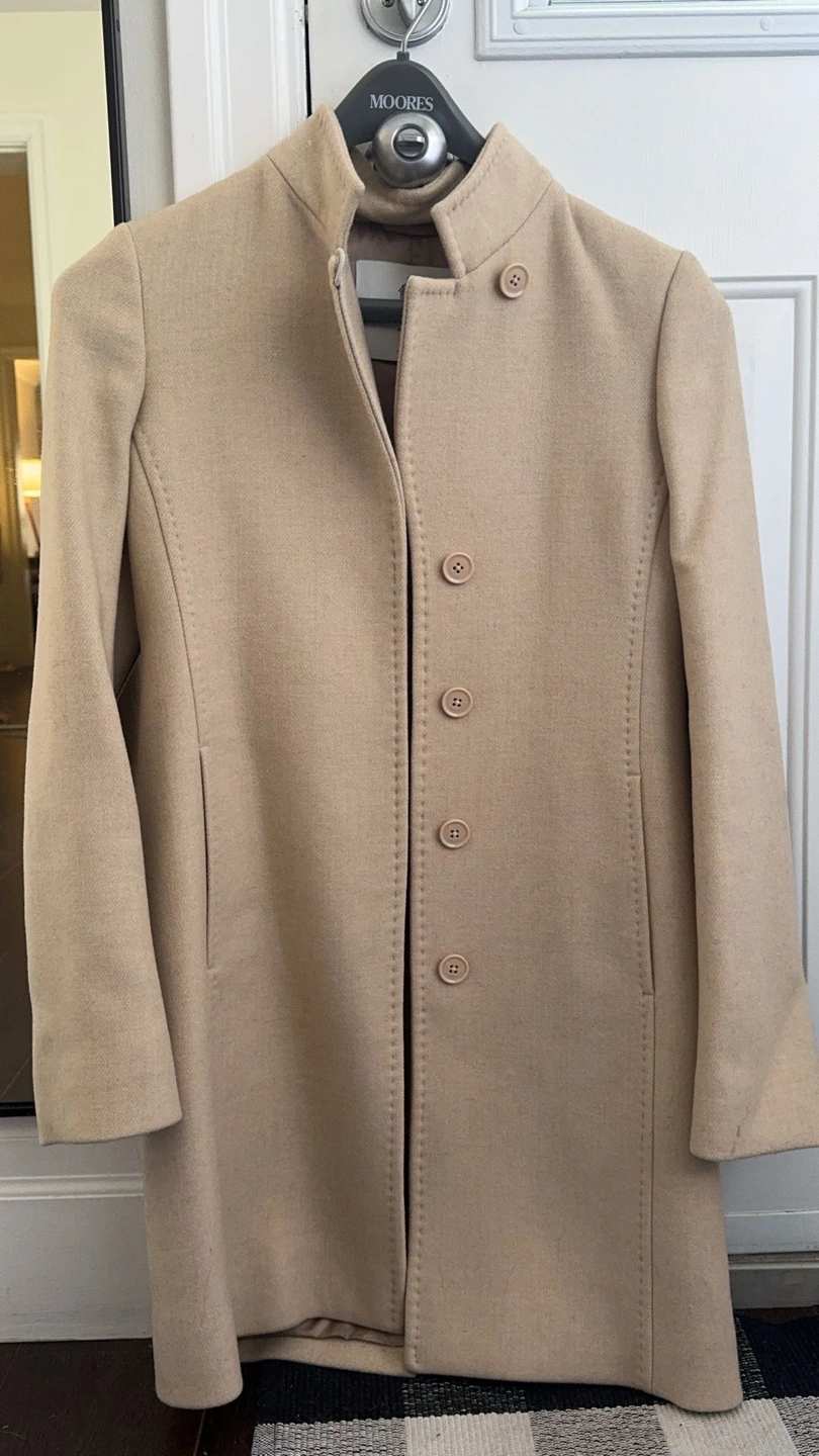 Beige coat with a mandarin collar and button closure. Long sleeves with button cuffs. Two pockets at the front. Lined.