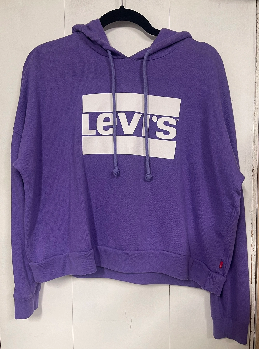 Details: cropped hoodie with a white Levi's logo on the front.