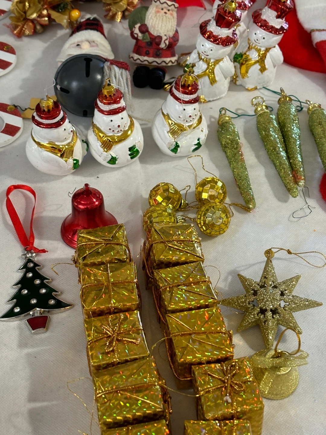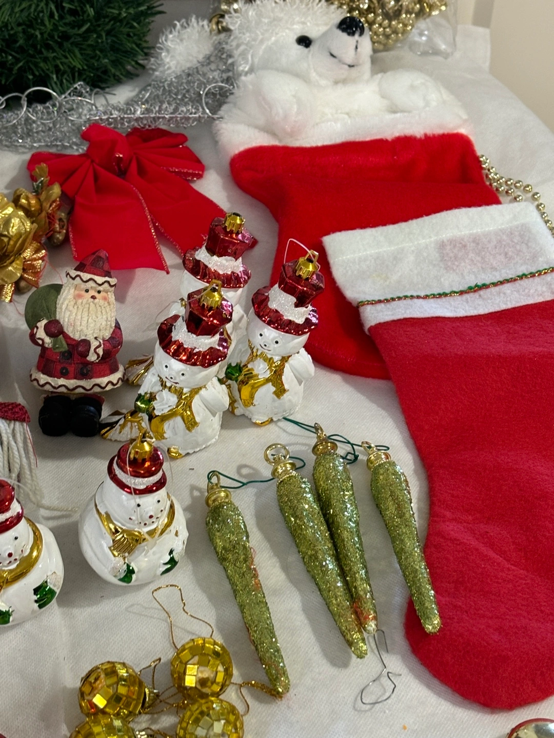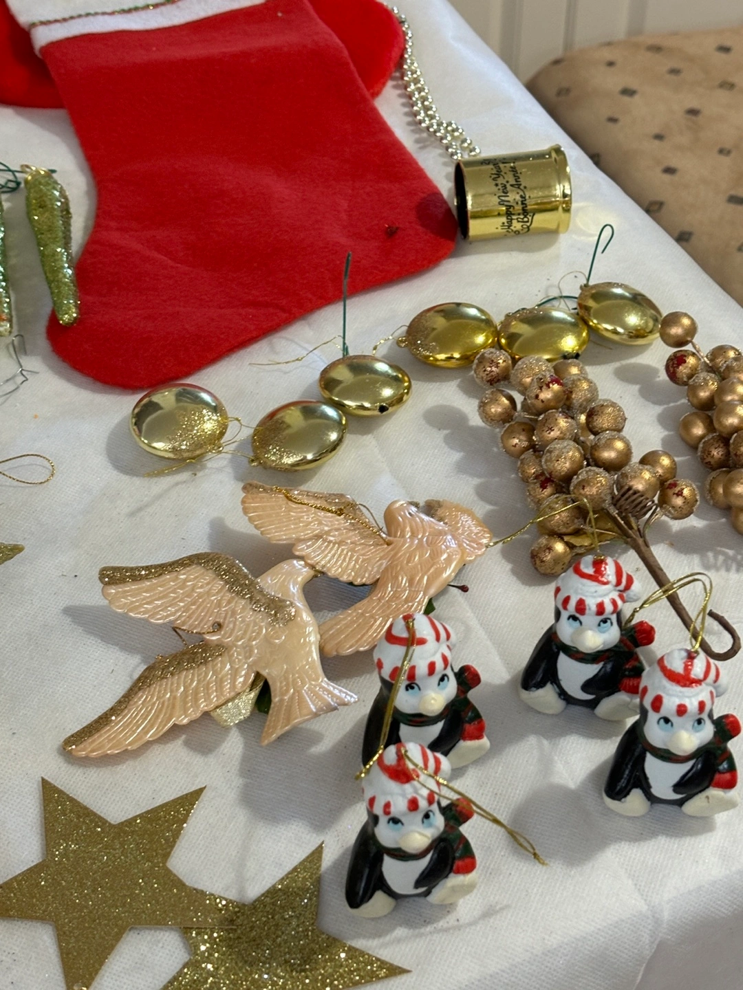25Large lot of vintage and new Christmas ornaments. Includes various shapes, sizes, and materials. A variety of styles are included, like snowmen, penguins, doves, and stars.