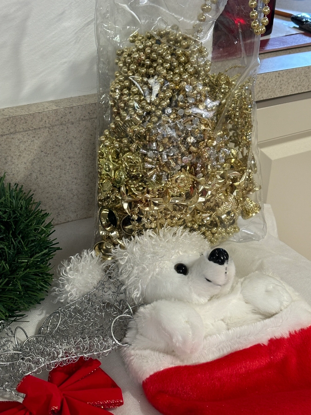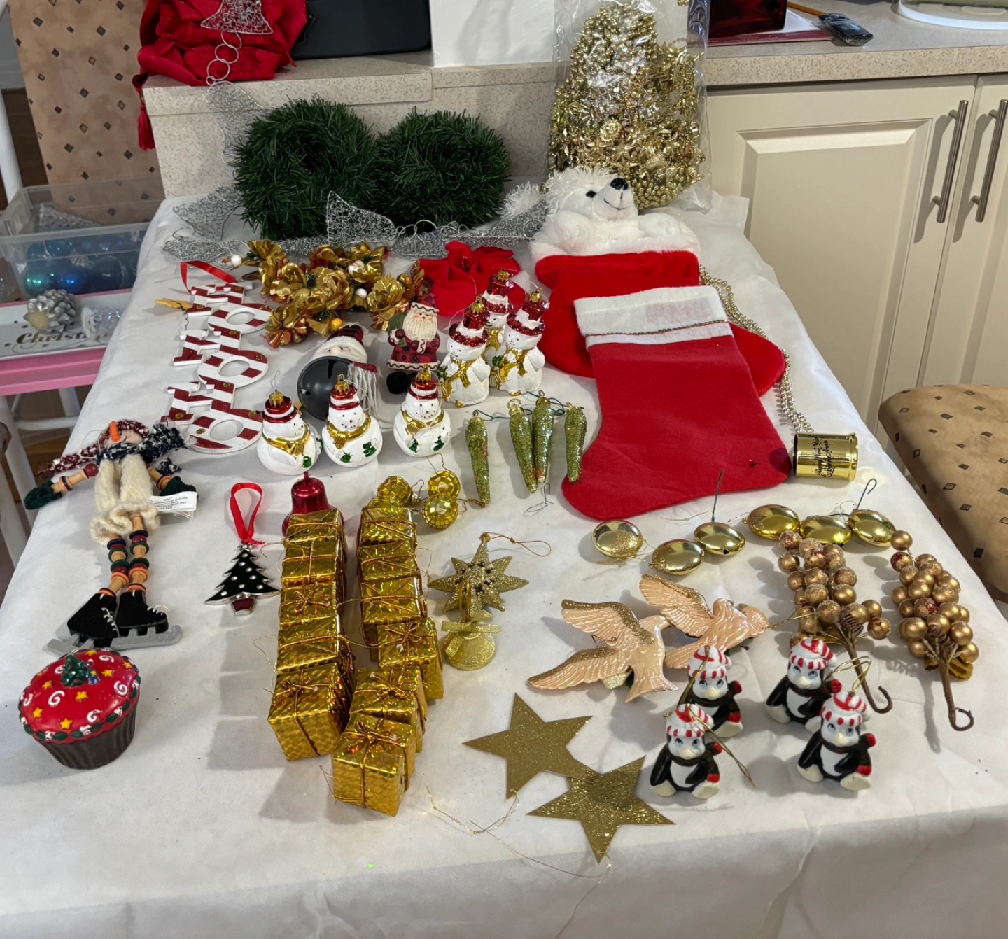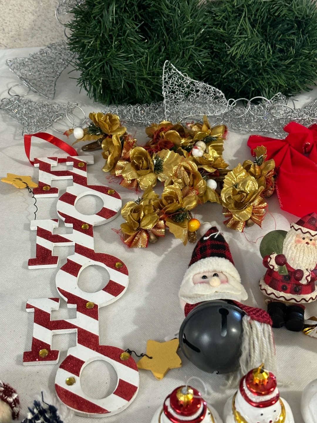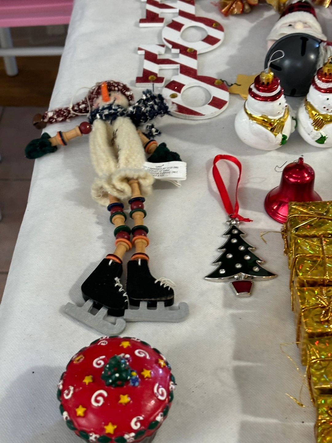 25Large lot of vintage and new Christmas ornaments. Includes various shapes, sizes, and materials. A variety of styles are included, like snowmen, penguins, doves, and stars.
