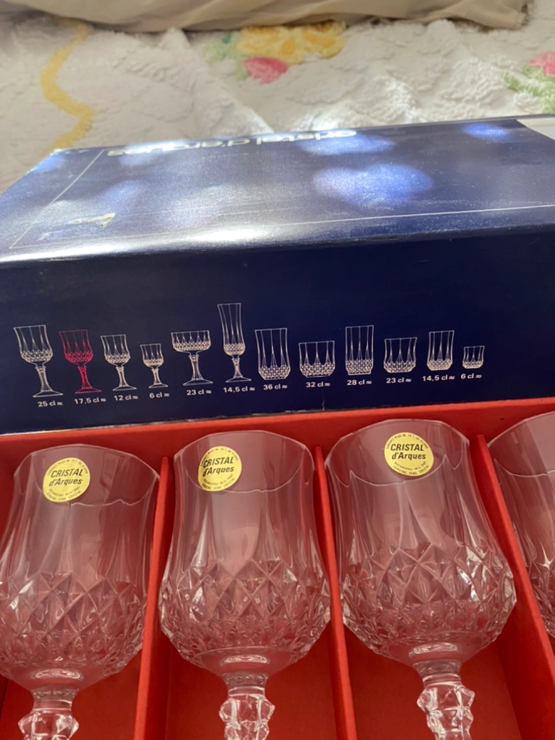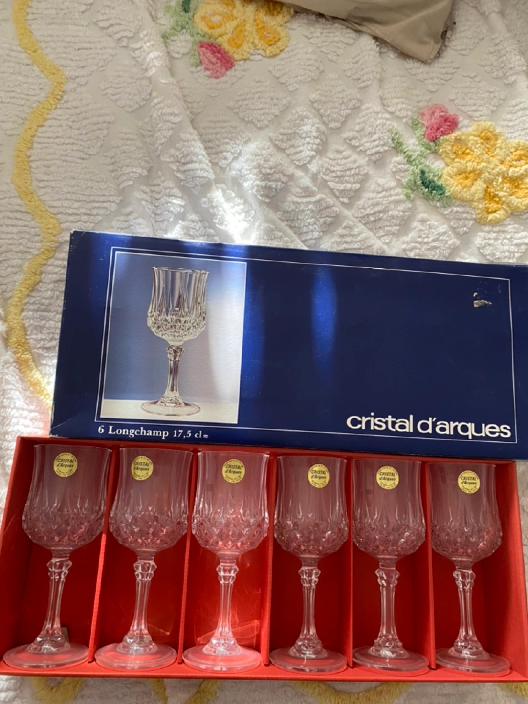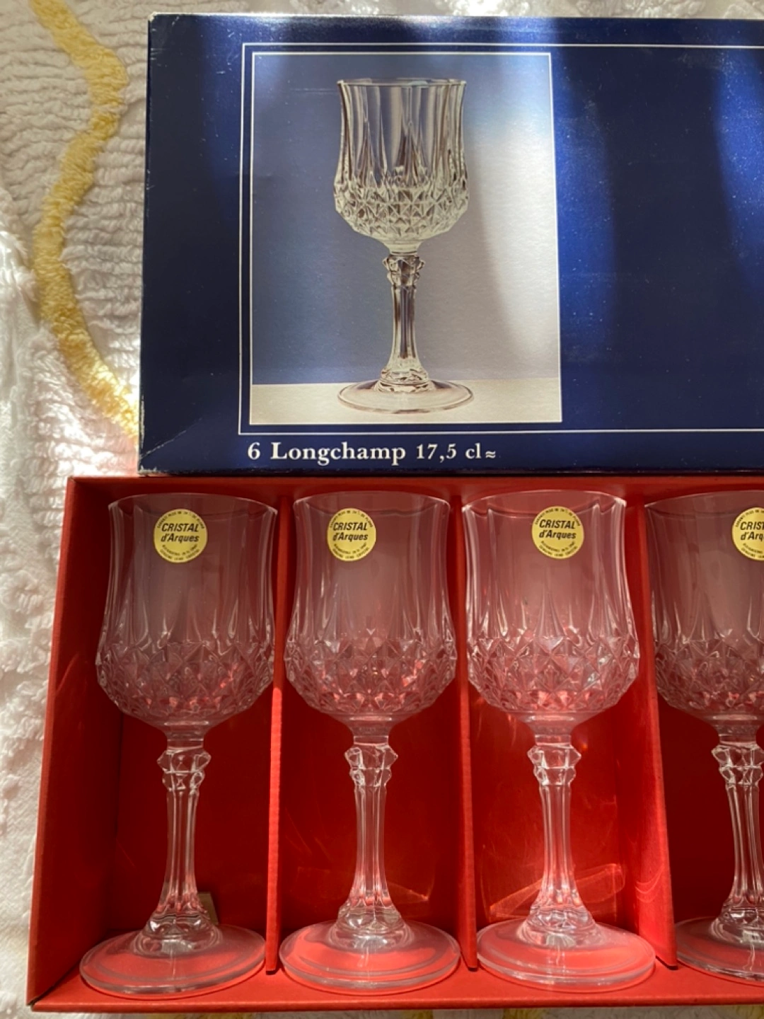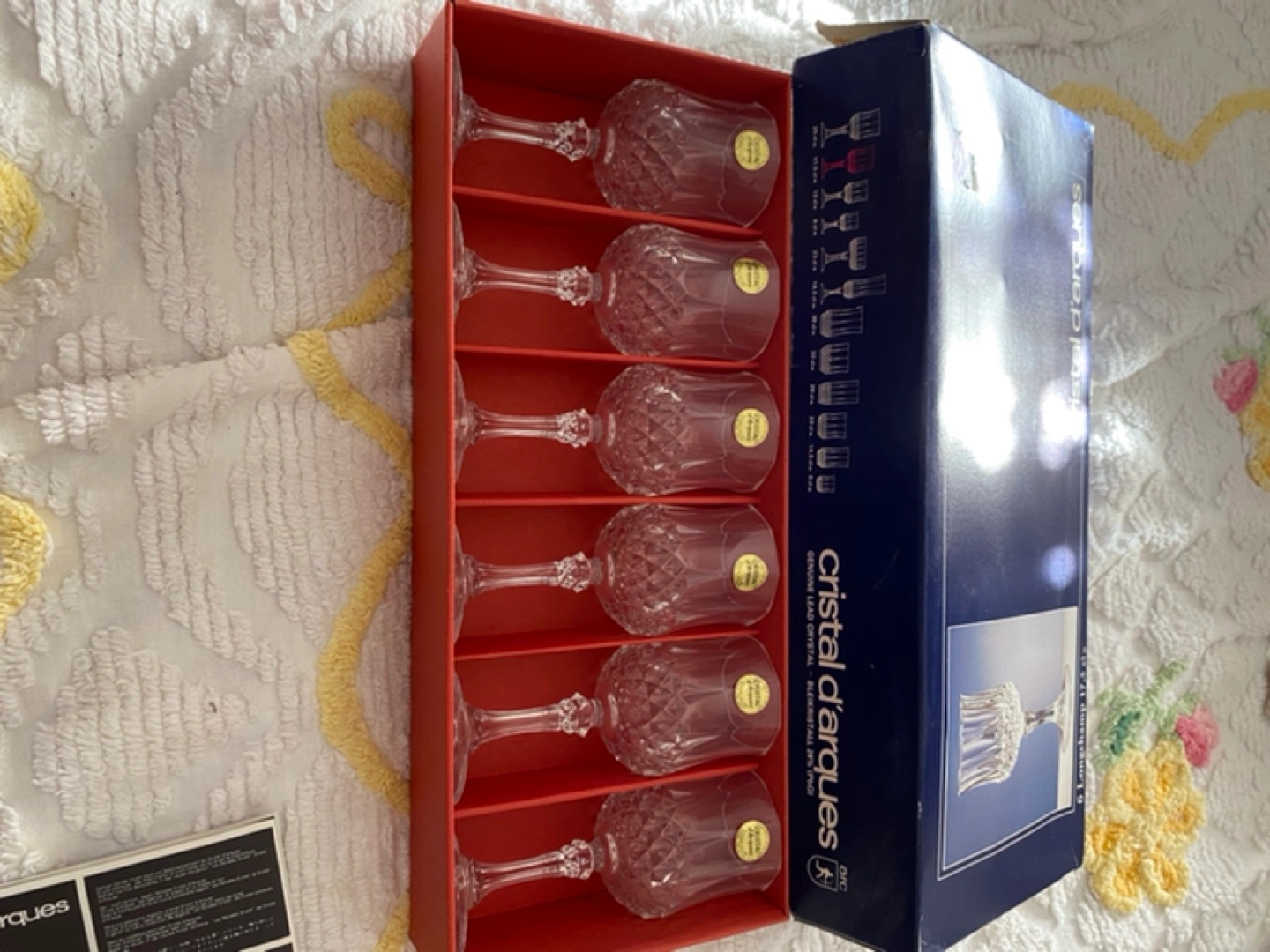 Set of 6 wine glasses. Crystal d'Arques brand. In original box.Cristal D'Arques Longchamp 17.5 CL 6 Footed Wine Glasses Lead Crystal Brand new in box never used. Pick up in the Jane and Church Streets Area. Cash only