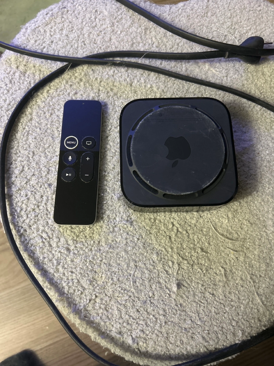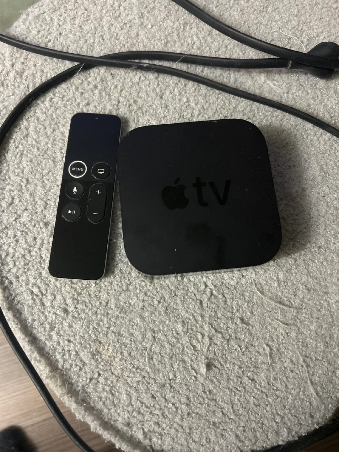 Apple TV with remote. Includes power cord and HDMI cable.