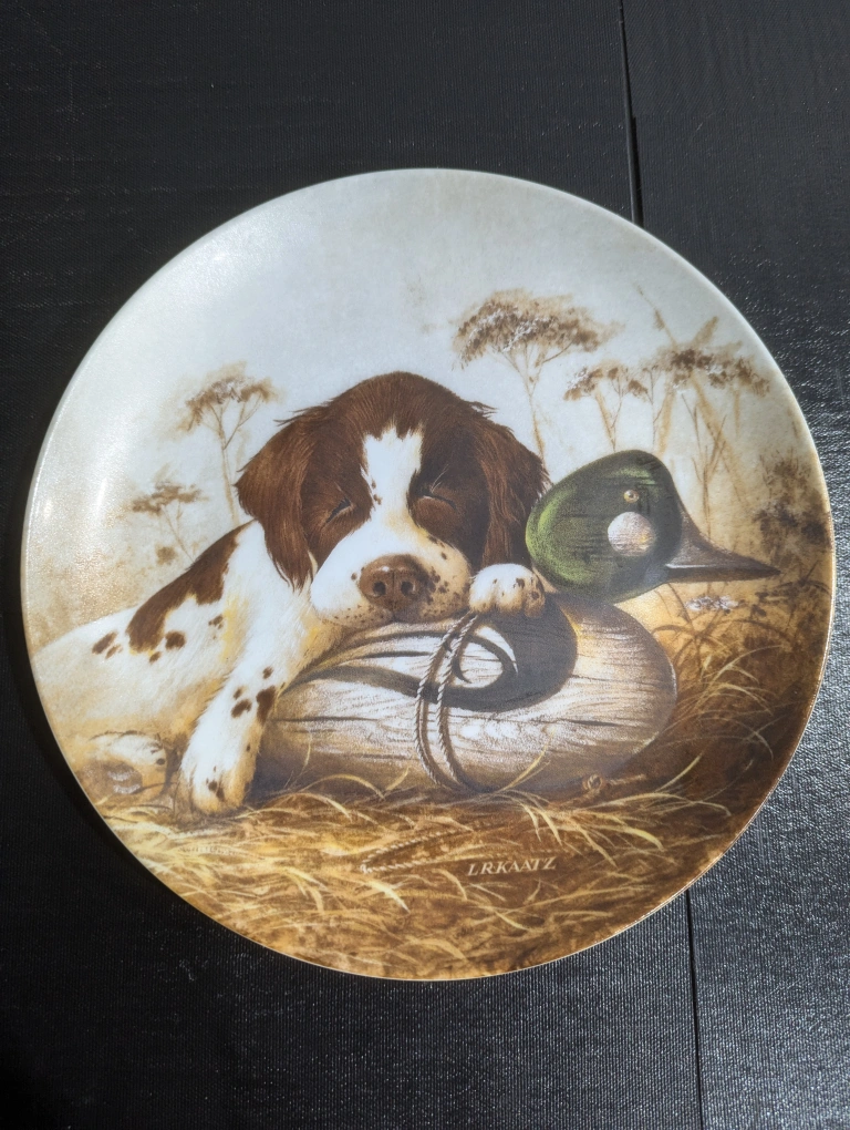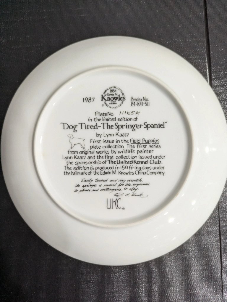 Limited edition collectible plate, "Dog Tired - The Springer Spaniel" by Lynn Kaatz. Measures 8.5 inches in diameter and is in excellent condition.