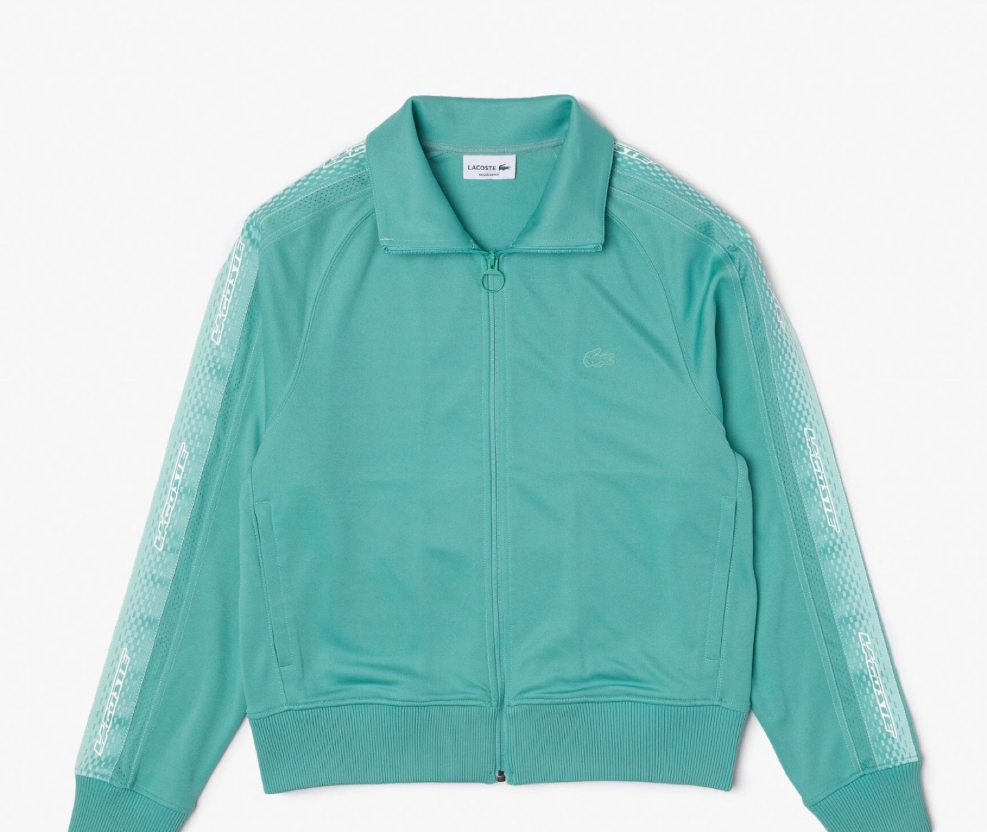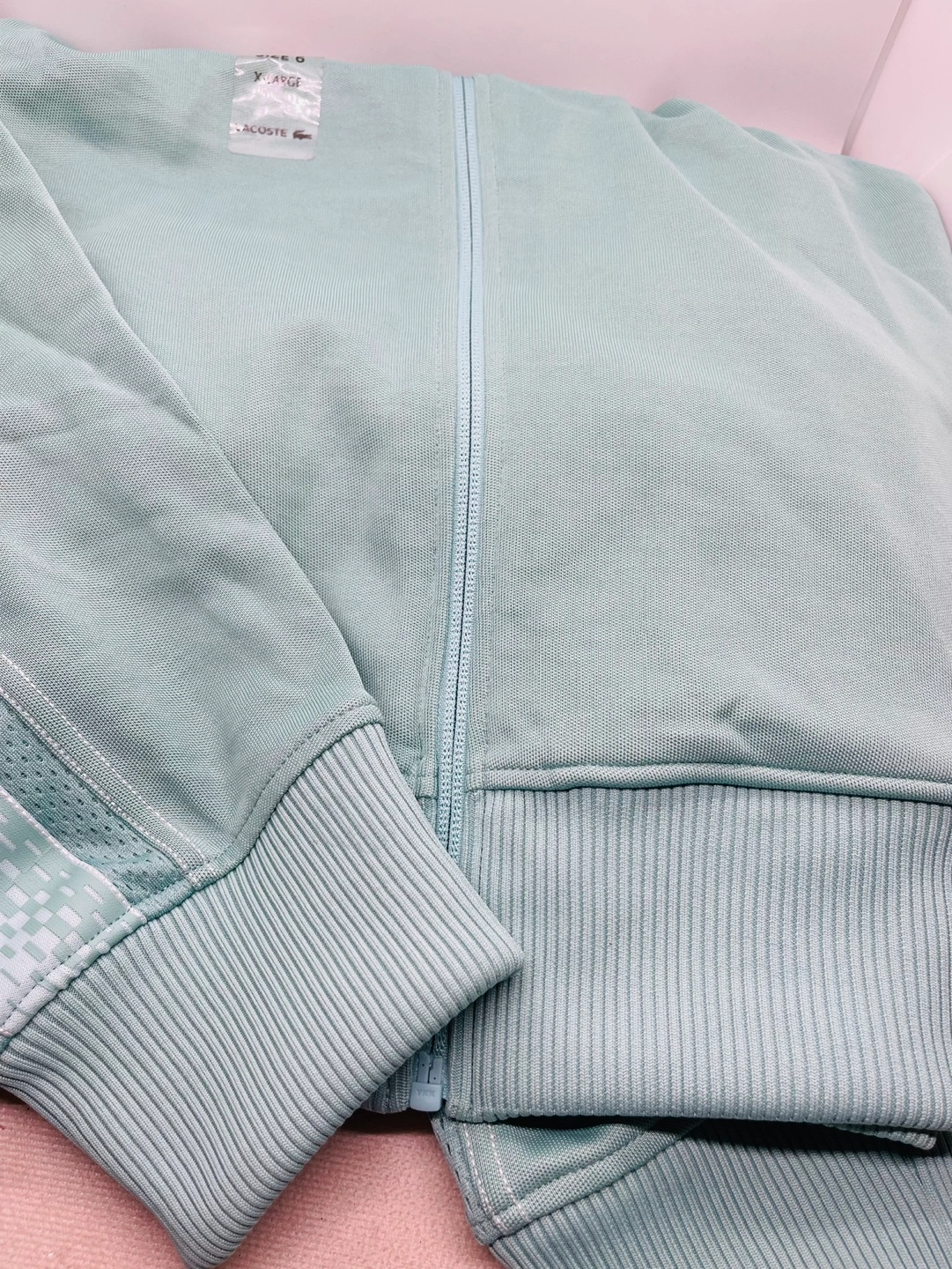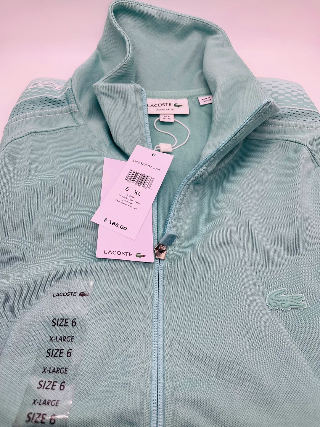 Green track jacket with white accents and Lacoste logo. Zipper closure and long sleeves.