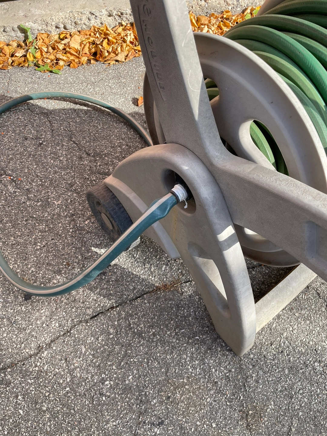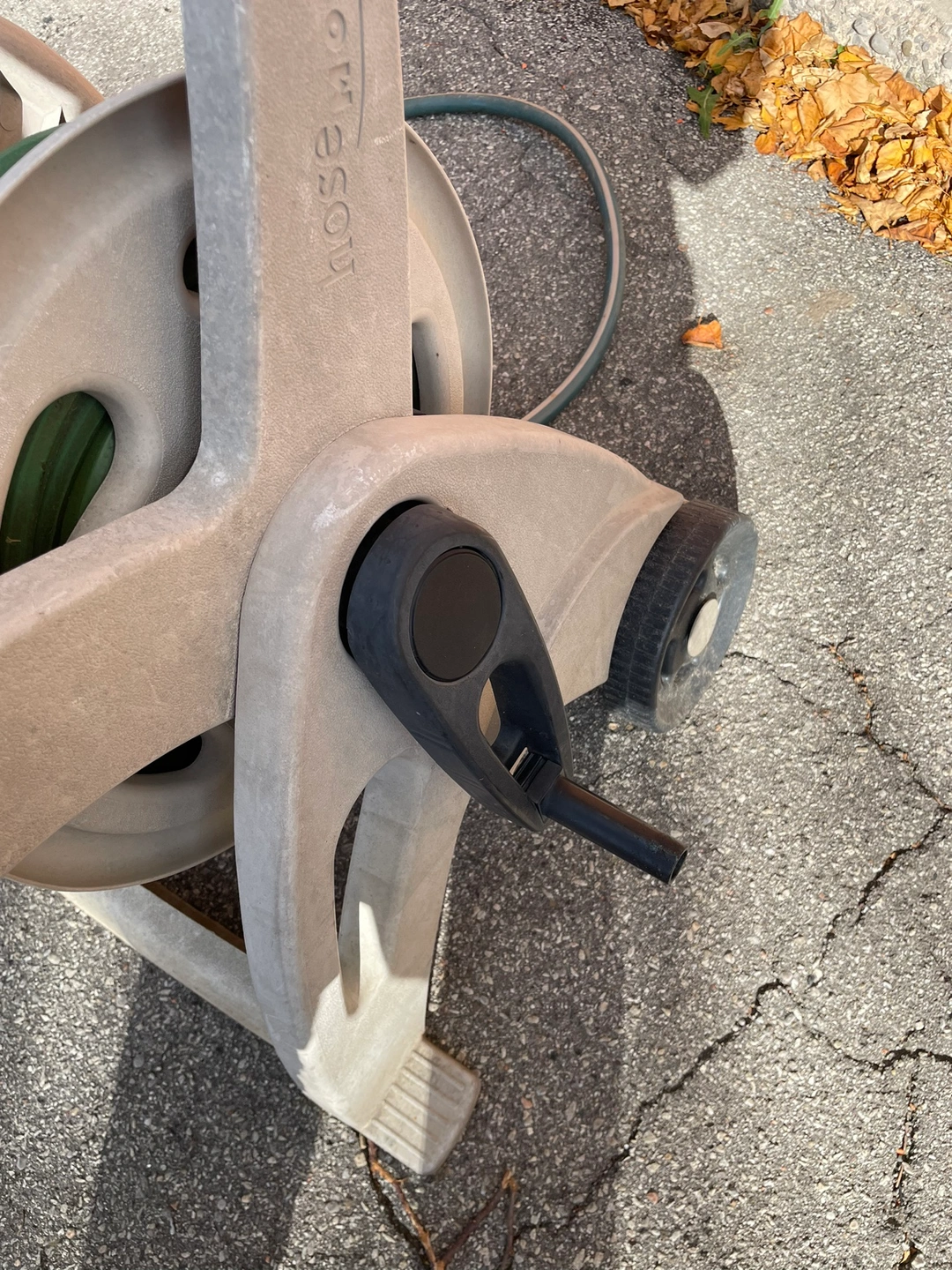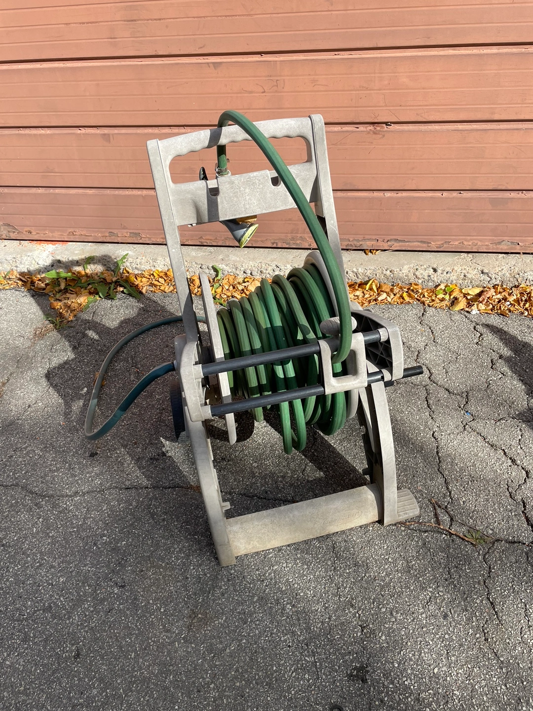 228Hose reel with wheels, handle, and hose. Includes a nozzle. Available for pick up at Don mills Steele east area. All sales are final