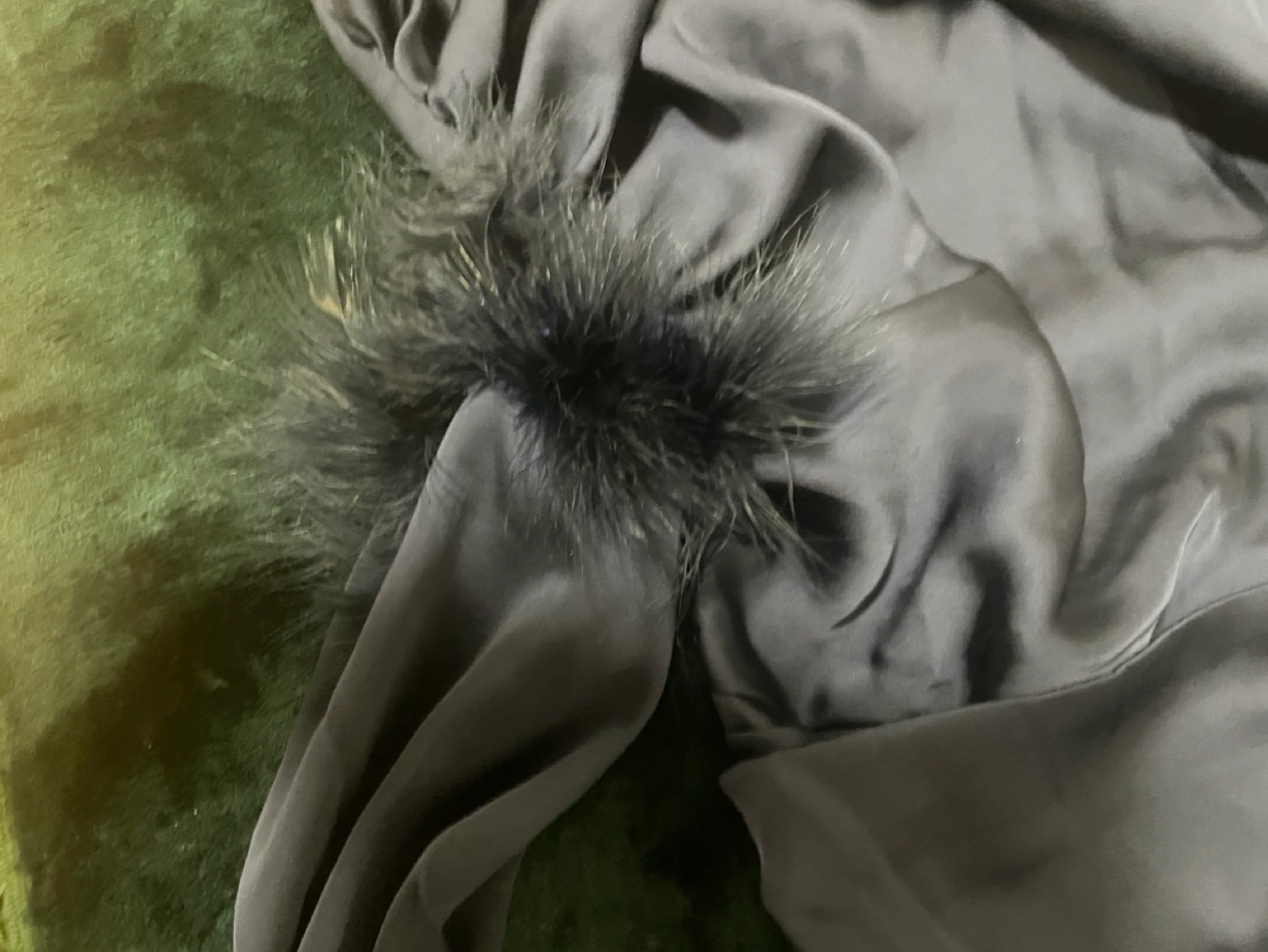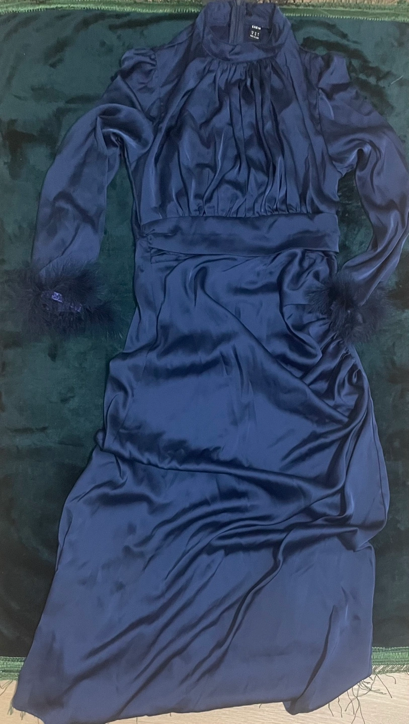 Long sleeve, floor length navy blue satin dress. Features feather detail on cuffs. Size Medium. Retails for $30+.