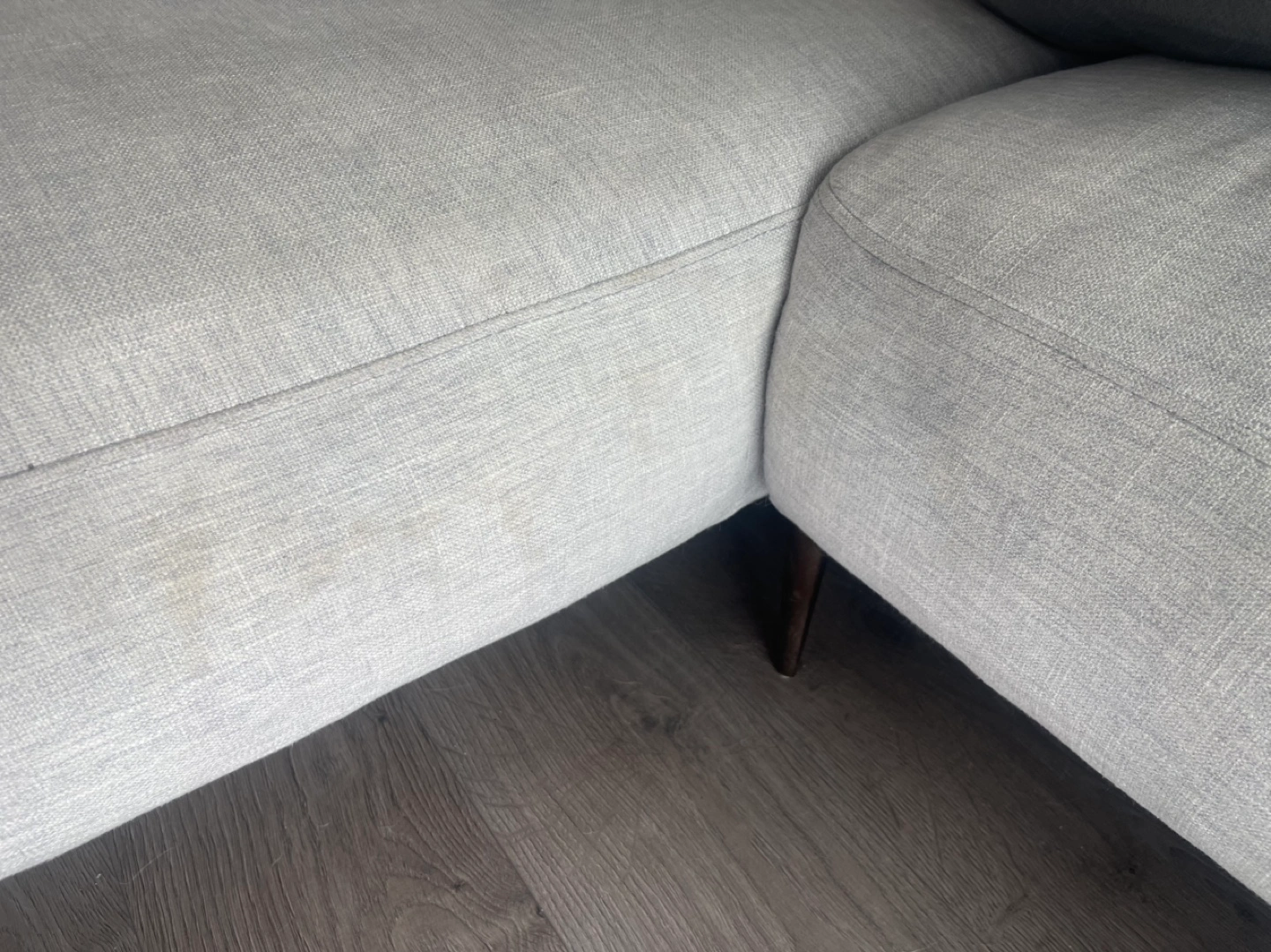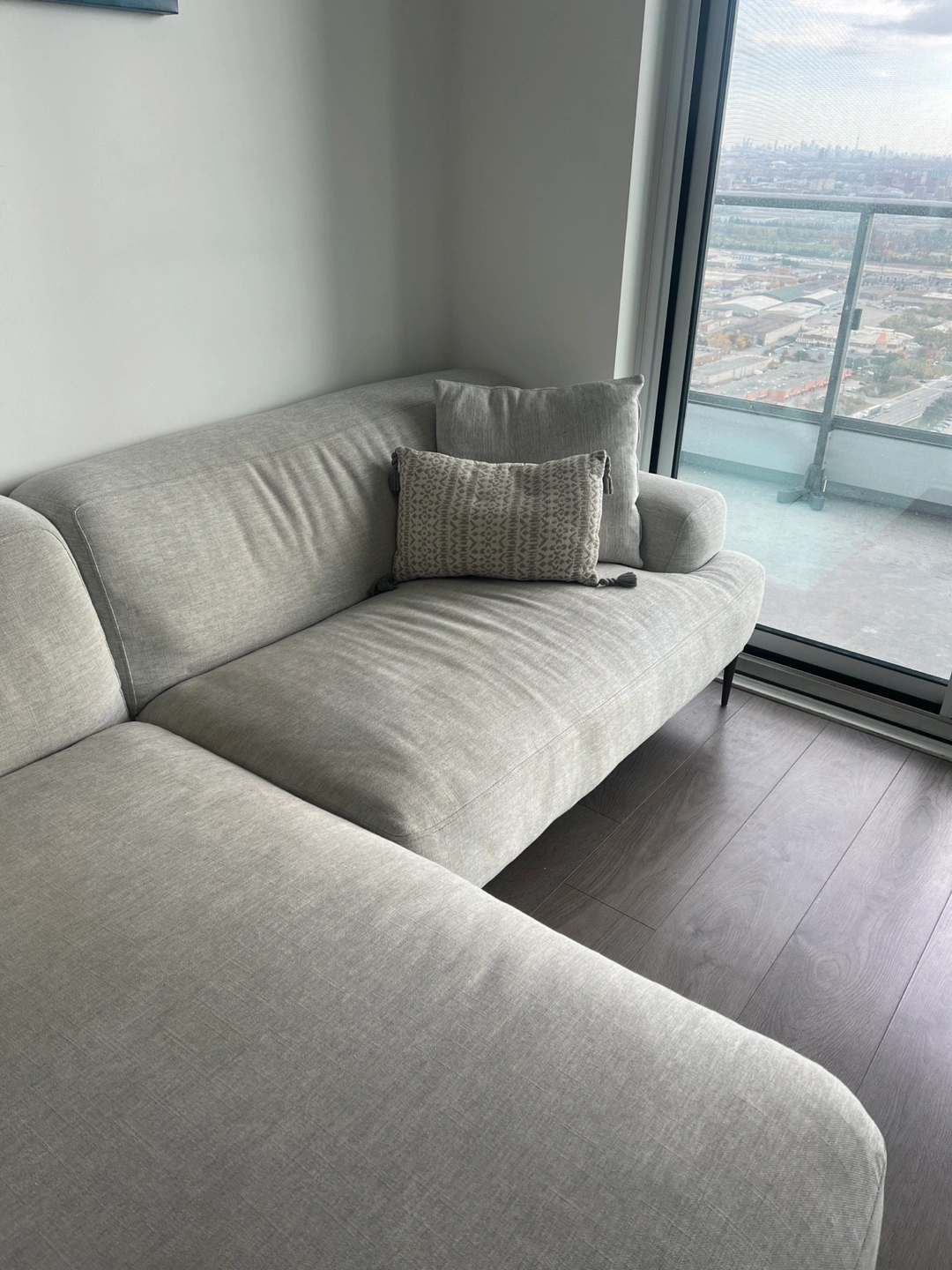 Very comfy mist gray color sectional sofa with matching ottoman. (metal legs) Includes four throw pillows. Some stain on the ottoman
