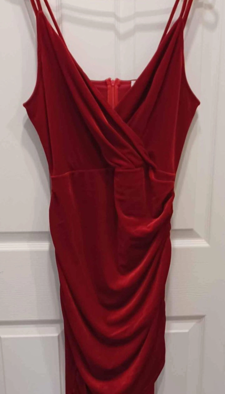 Red velvet dress, size M . Can fit L also.Features a v-neck, adjustable straps, and a back zipper. Knee size