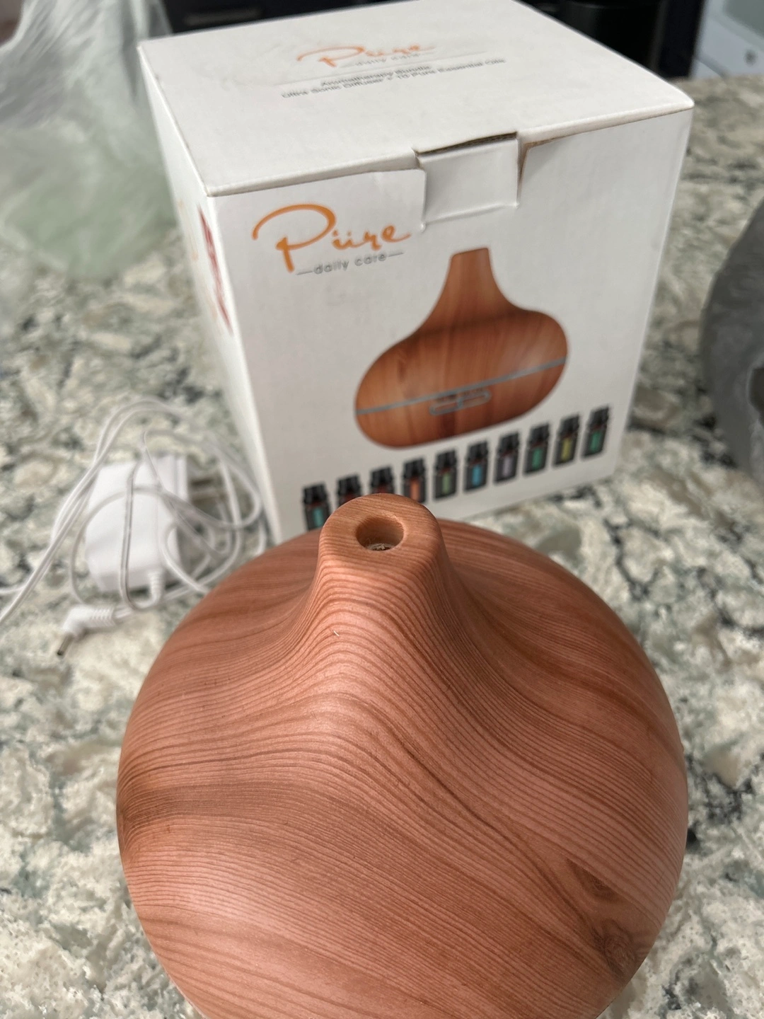 Ultrasonic diffuser with 10 essential oils. Wood grain finish. Includes power adapter.