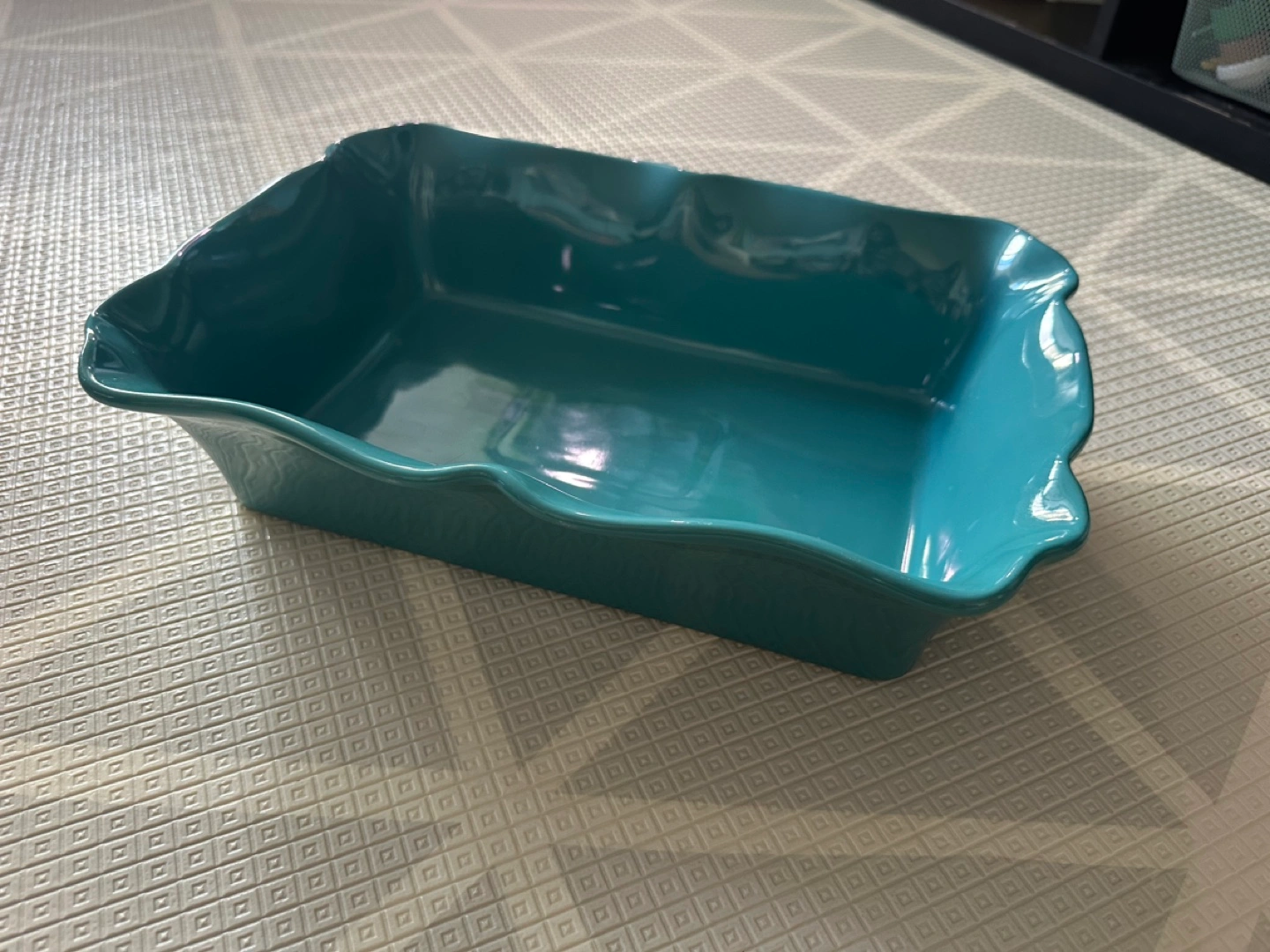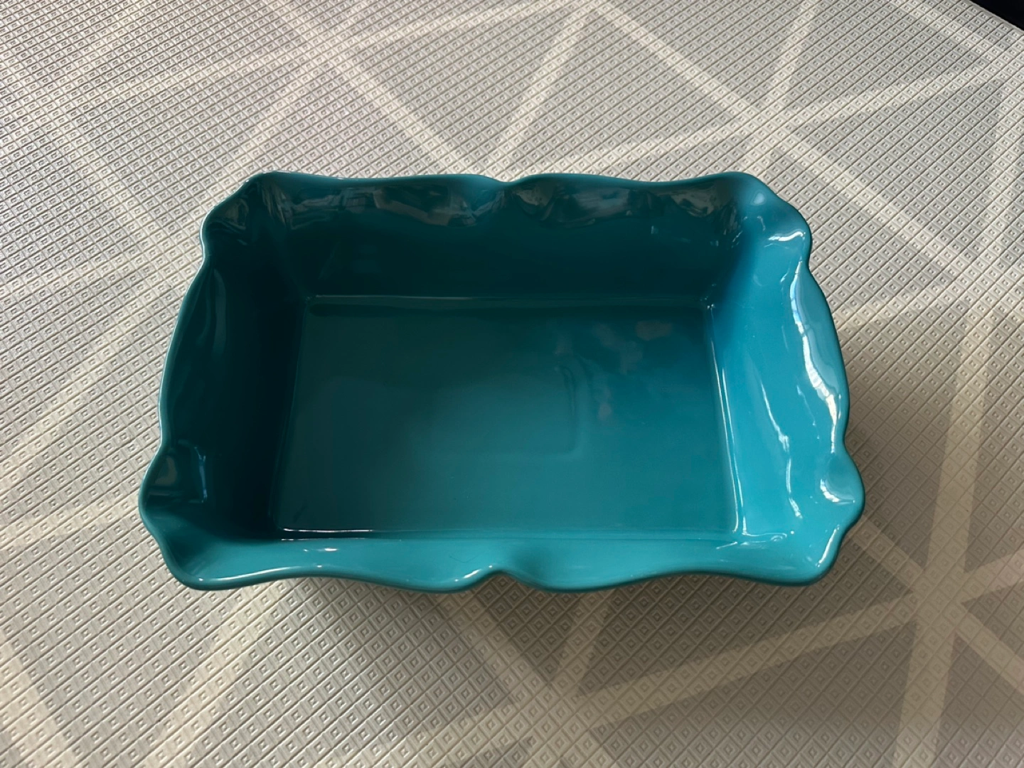 Very pretty teal blue colour. Nice large size serving dish! Great for upcoming holiday season. Brand new, never used it!