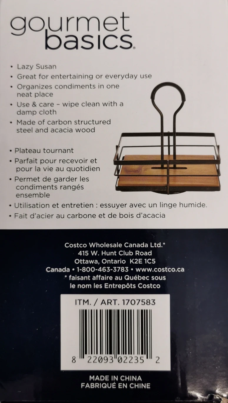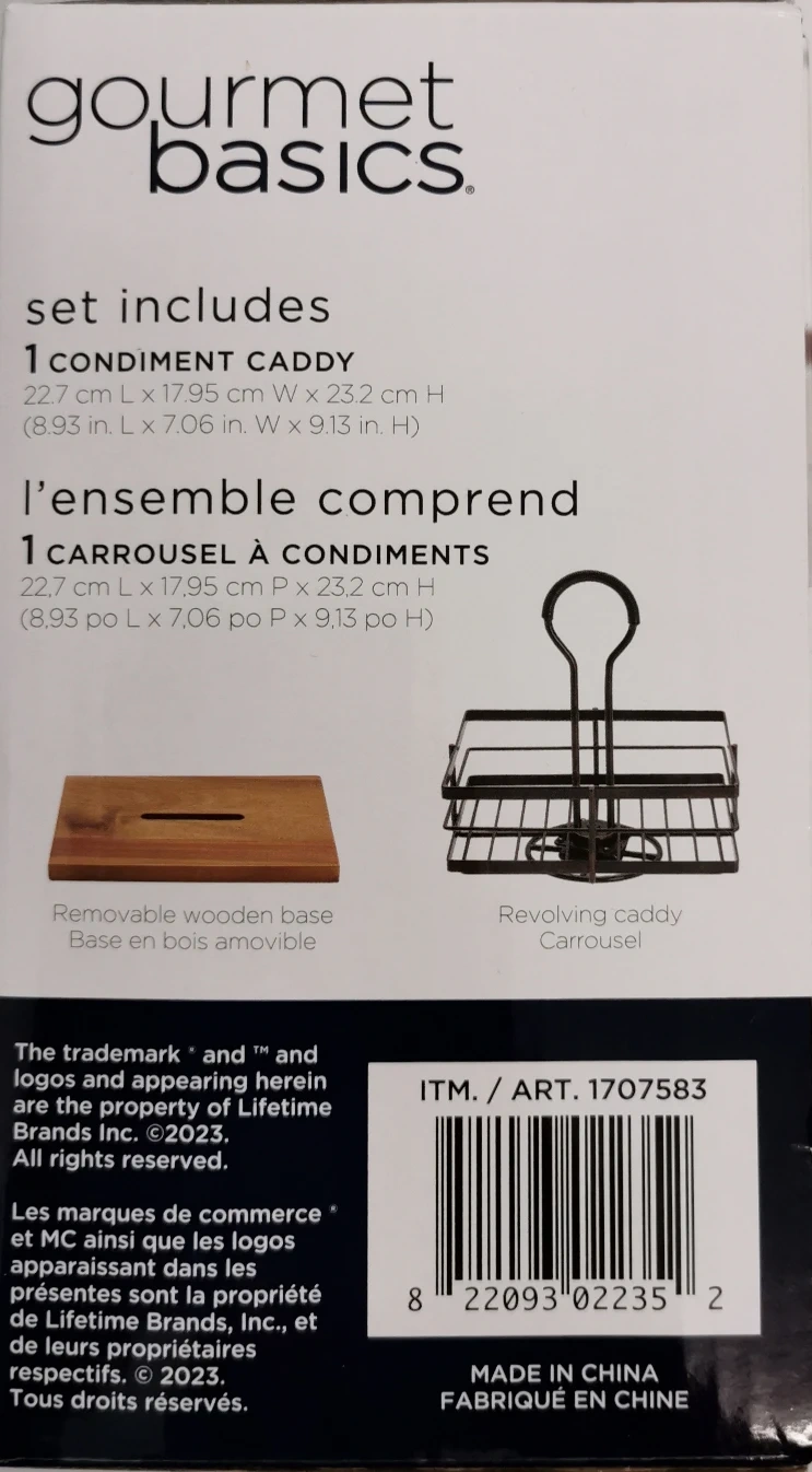 Revolving condiment caddy with removable wooden base. Includes metal frame and revolving carousel. Made of steel and acacia wood.